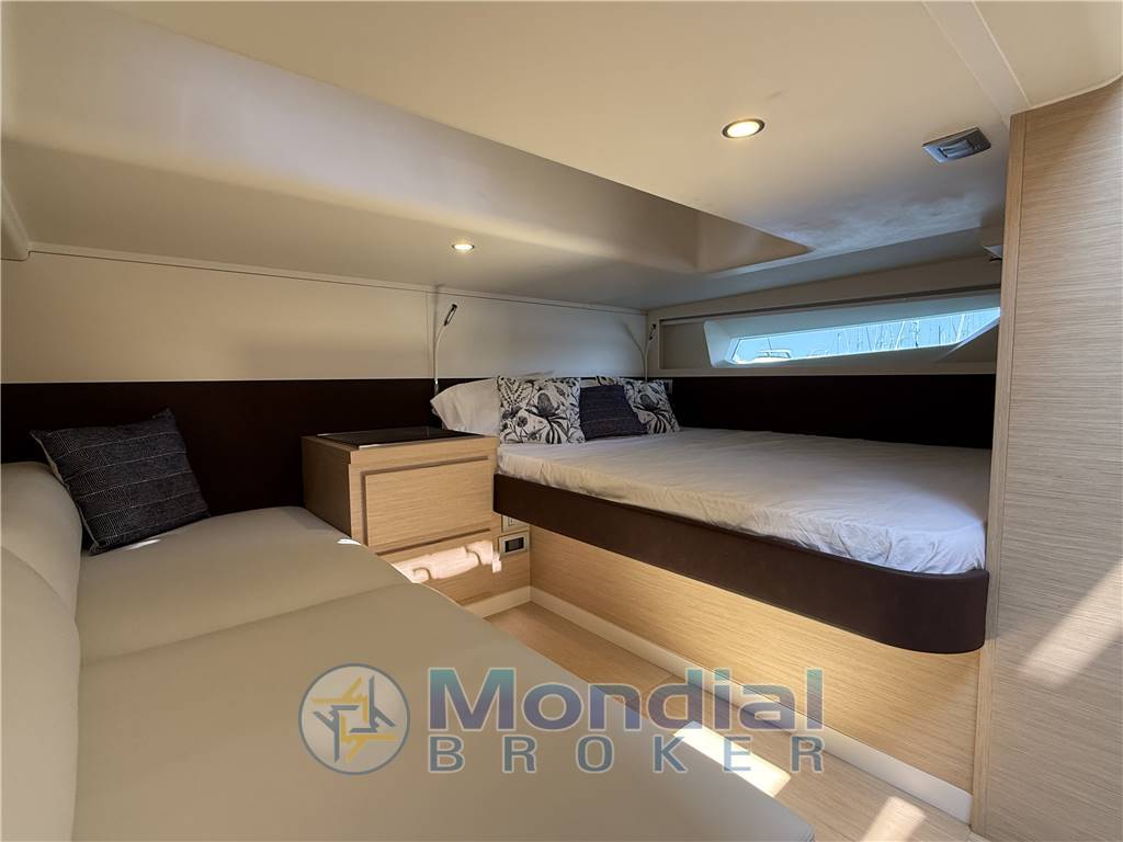 Antincendio: allarme per cabina (2); Bimini poppa con pali amovibili in carbonio completi di supporti per stivaggio; Pacchetto cover (il pacchetto comprende: cover consolle, tavolo, seduta PP, prendisole PP, prendisole PR, sedili pilota); Pacchetto luci di cortesia, comprende: luci esterne camminamento, luci T-Top, luci pop-up prendisole prua, illuminazione poppa da prendisole; Impianto stereo performante