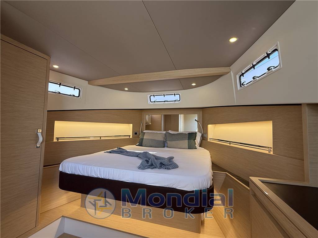 Sottocoperta troviamo la vera e propria magia di Solaris, ovvero riuscire a creare degli spazi solitamente disponibili su imbarcazioni di metratura superiore. Finitura rovere. L’altezza è notevole, parliamo di ben 2 metri e, come per la coperta, il layout è con cabina armatoriale di poppa completa di vetrature a scafo e seconda matrimoniale in open space a prua.