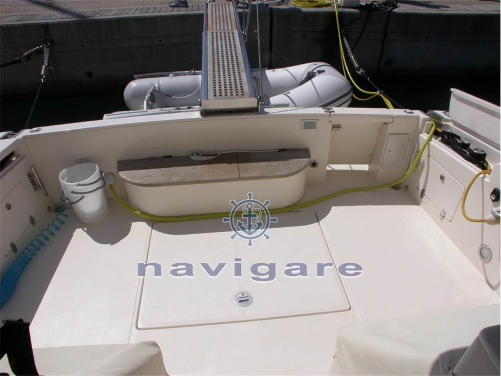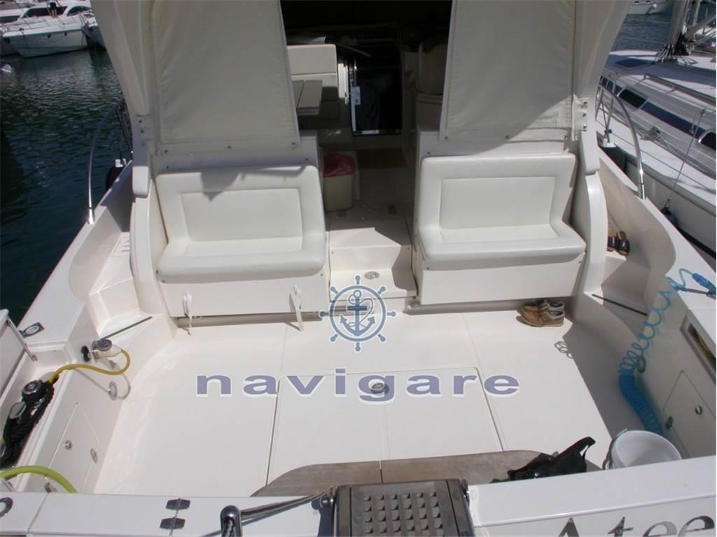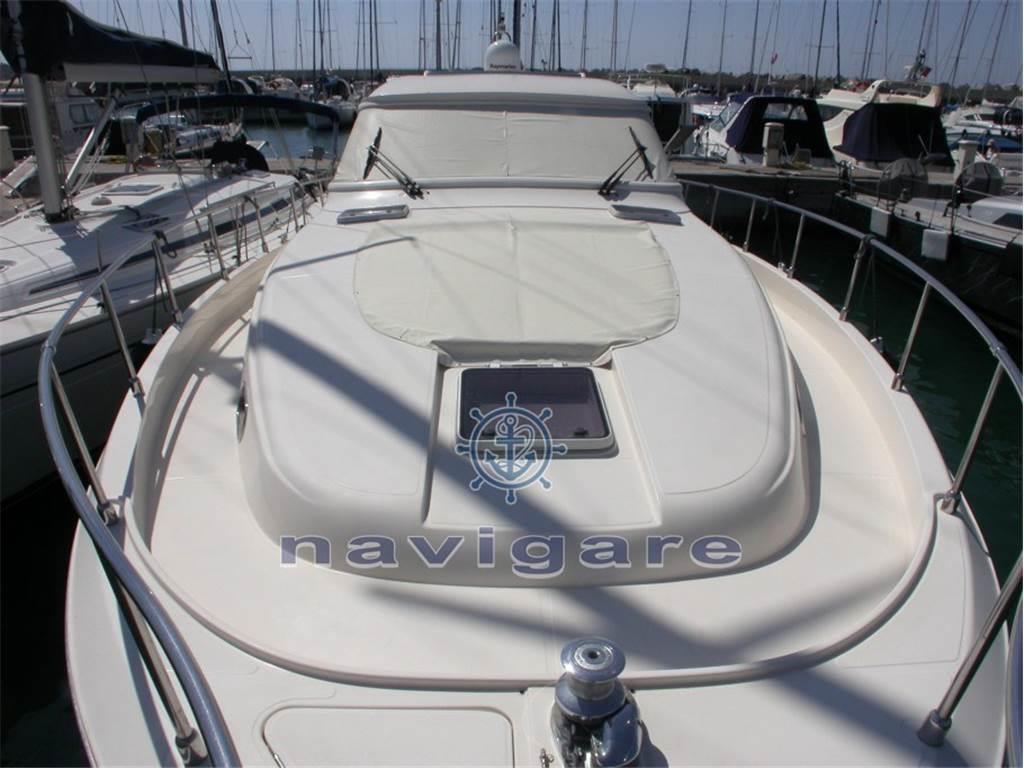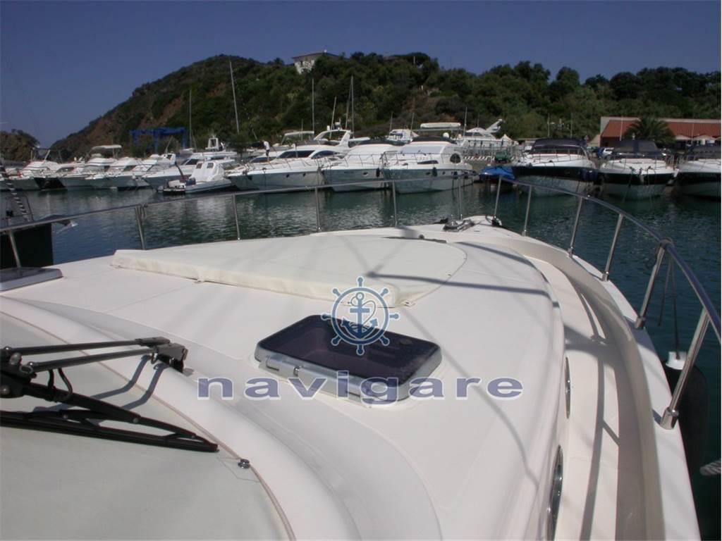 La carena a V profonda con angolo di 18° a poppa consente una navigazione morbida e piacevole. La disposizione degli arrediinterni, realizzata in pregiato ciliegio, conferisce un esclusivo comfort nell?eleganza più raffinata. Le cabine sono due doppie compresa quella dell?armatore, dotate del proprio bagno e doccia. L?area di centro poppa è suddivisa in due zone: il pozzetto superiore dove è situata la dinette con servizio cucina (fornibile su richiesta con Hard Top ad apertura elettrica), e il pozzetto di poppa per le attività nautiche.