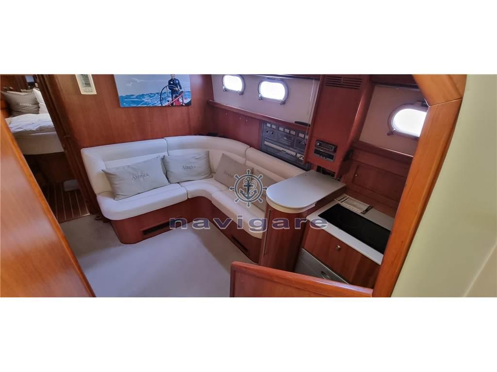 parquet interno in ciliegio, tendine interne alla veneziana - pavimento in teak interno - la barca e disposta: cabina armatoriale a prua con bagno, doccia con porta girevole - cabina ospiti letto alla francese - bagno con lavandino e doccia (tenda) - dinette con cucina con fuochi elettrici - aspiratore - frigo grande con ghiacciaia, lavastoviglie - forno a microonde e vari cassetti e sportelli per riporre le utensili - ampio divano ad "l" con tavolo - dinette esterna al pozzetto superiore con mobile cucina a scomparsa con n. due fuochi a gas - ulteriore frigo inox con n. due cassetti sotto il sedile guida - divano ad "L" con tavolo a libro.