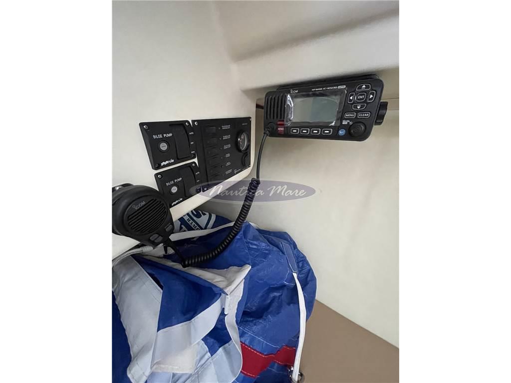 Timone con prolunga custom e asta portabandiera in acciaio inox, antivegetativa Coppercoat, parabordi, àncora Guardian con cima, sistema Micronet Race Master con trasduttore.