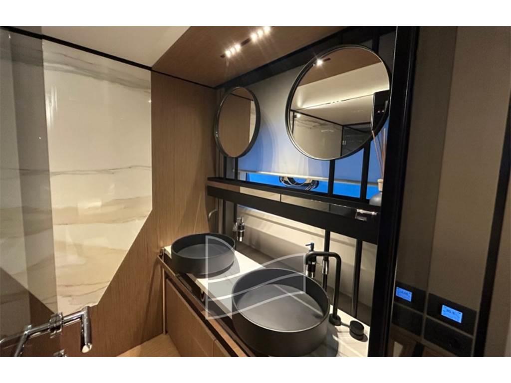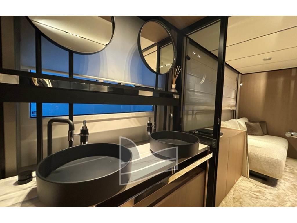 Master cabin a tutto baglio: uno spazio ampio, luminoso e silenzioso, posizionato al centro dello scafo per massimizzare stabilità e comfort. Il bagno en suite e le finiture ricercate contribuiscono a creare un ambiente intimo e sofisticato.