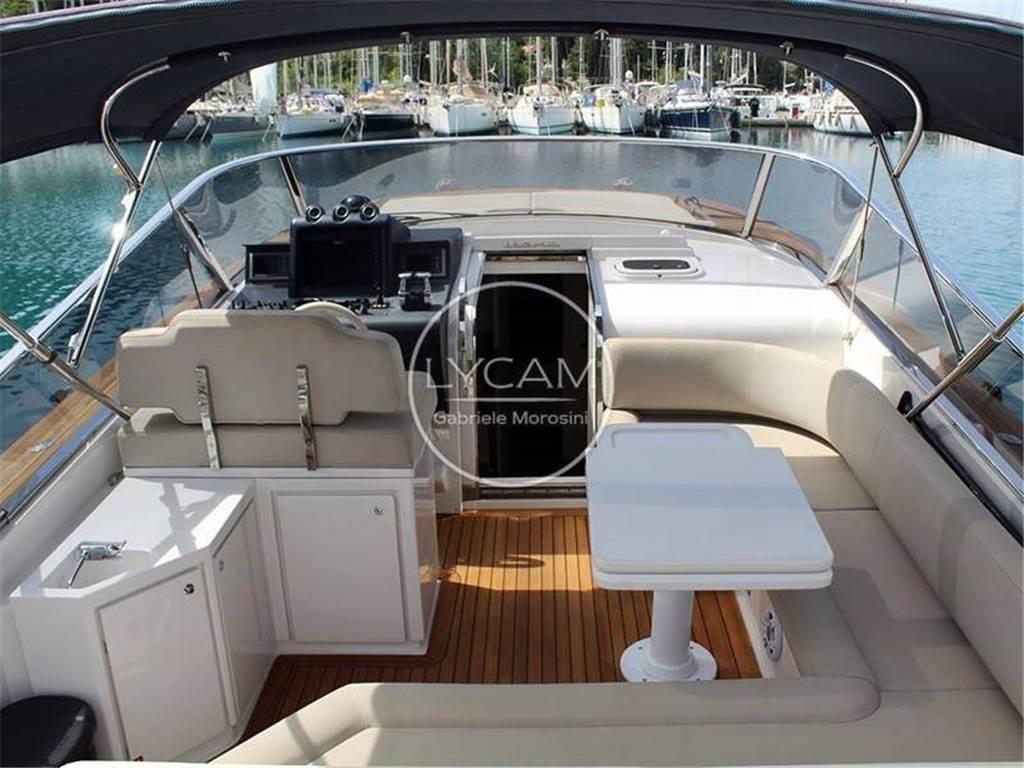 Attraverso l’ampia plancia poppiera in teak si accede al pozzetto costituito da un comodo prendisole a poppa, una dinette esterna con divano a L lungo la murata di dritta mentre sul lato opposto sono stati collocati un piccolo mobile bar e la timoneria con le sedute per pilota e co-pilota.