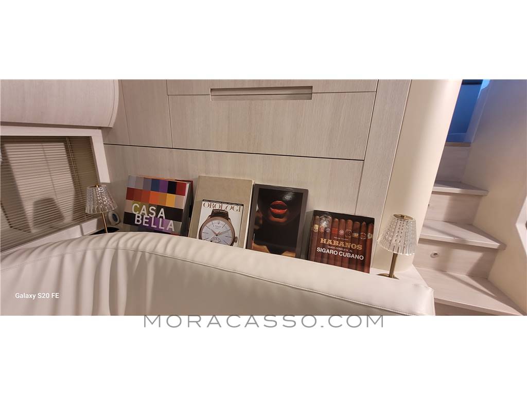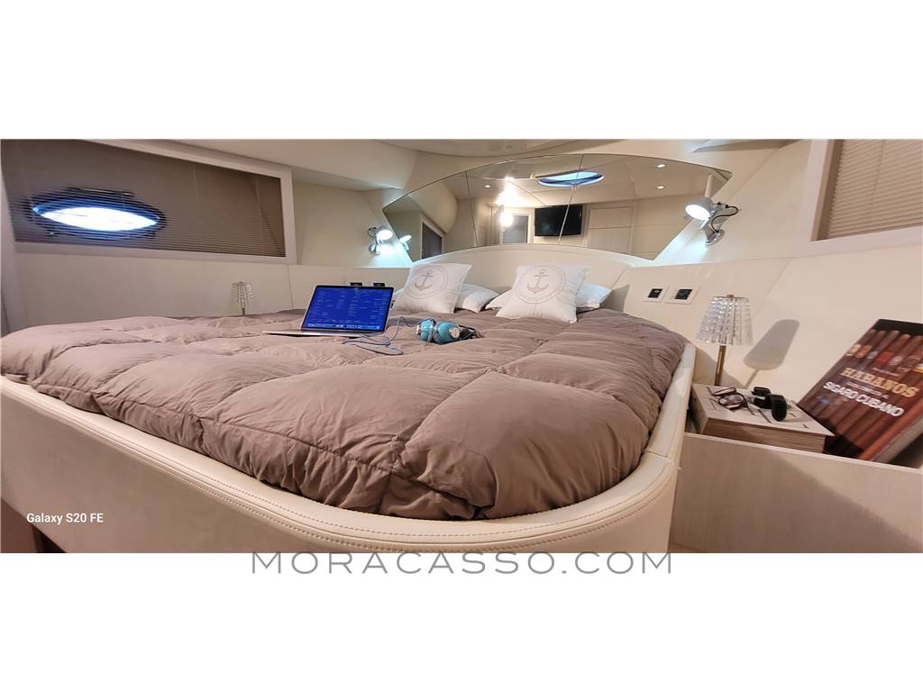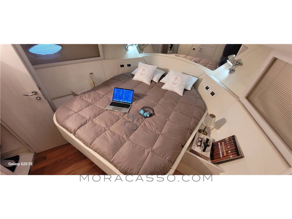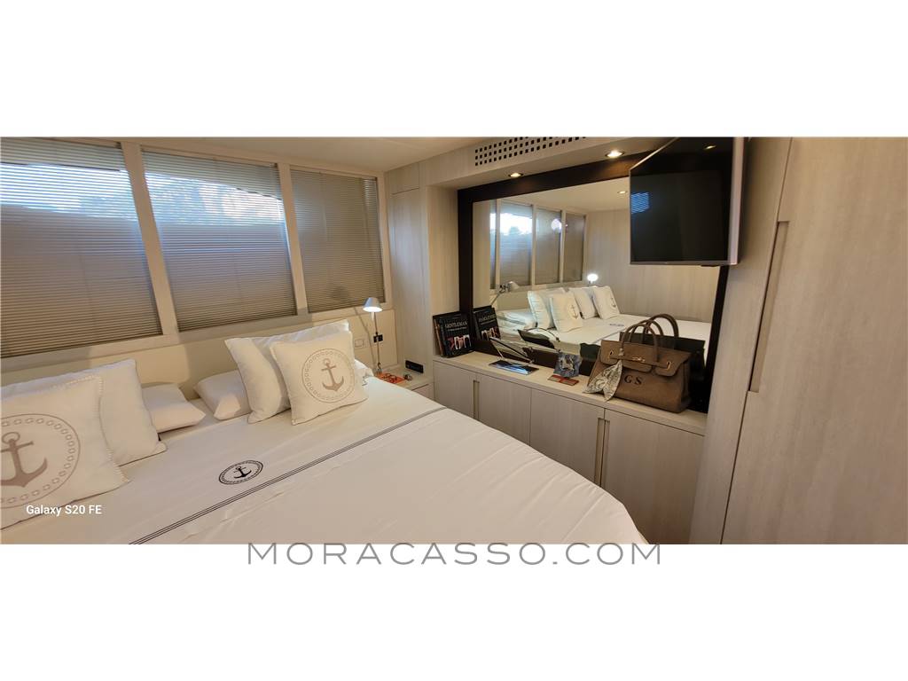Il layout degli interni è composto da cabina armatoriale a centro barca a tutta larghezza, e quindi full beam, con letto matrimoniale volante, al suo interno TV Lcd, bagno e box doccia con porta in plexiglass semicircolare, il pavimento e in teak naturale.