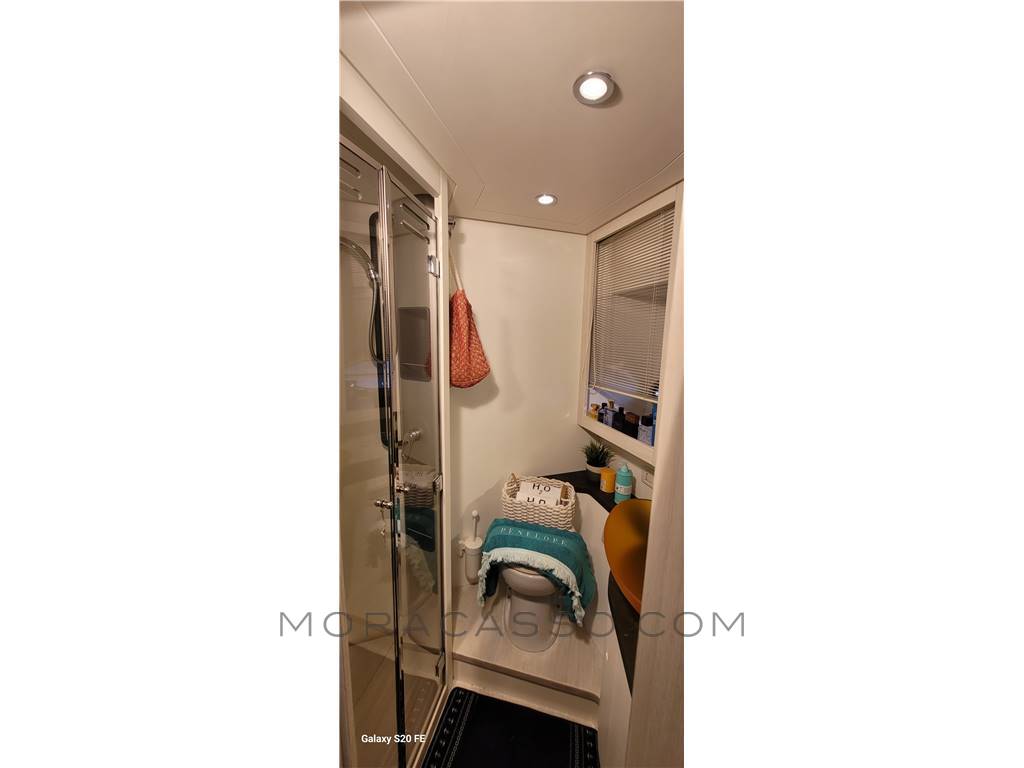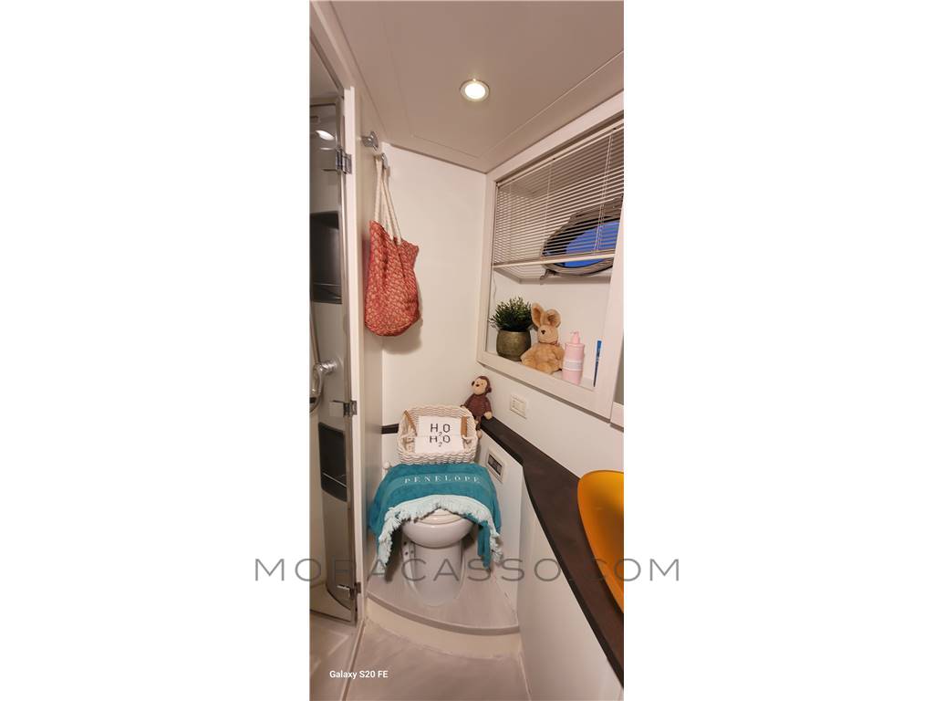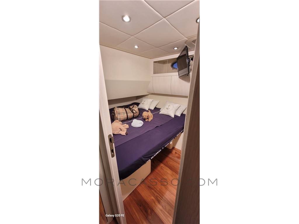 A centro barca rimane la cabina ospiti doppia con due letti paralleli, con TV Lcd ed un armadio grande, il bagno a servizio di questa cabina, rimane nel corridoio e viene anche utilizzato come bagno a giorno, l'accesso avviene dalla dinette interna.