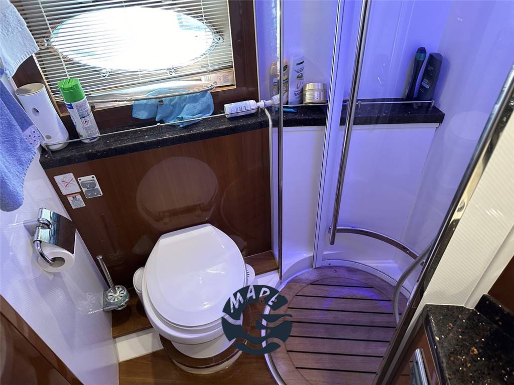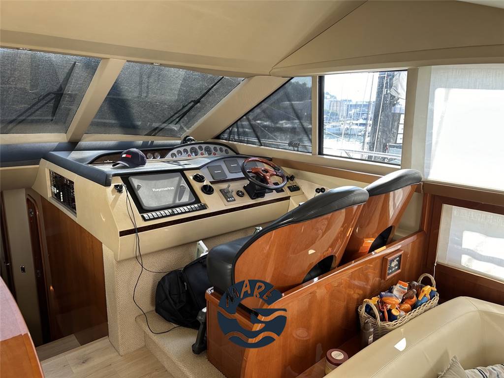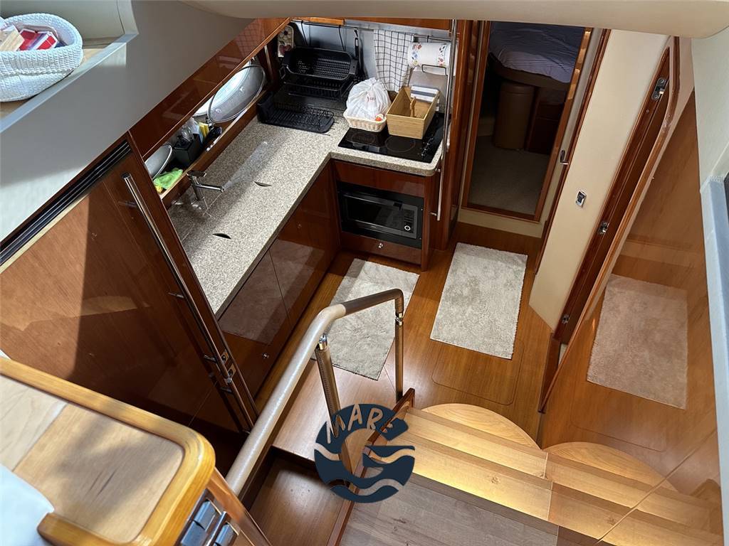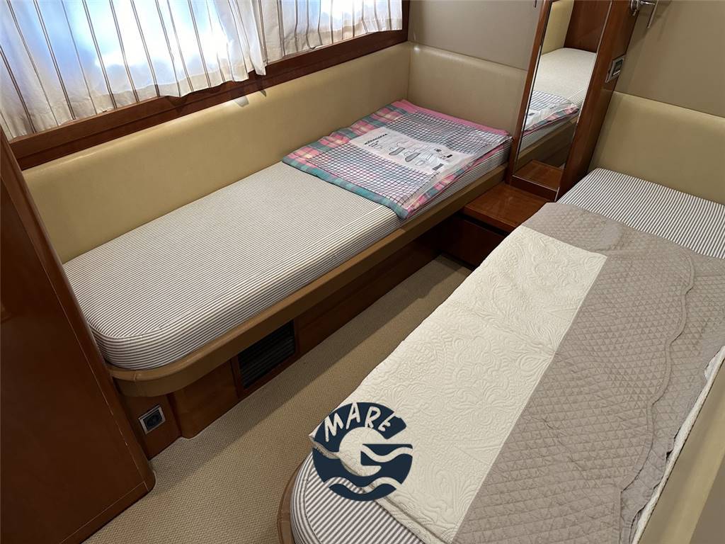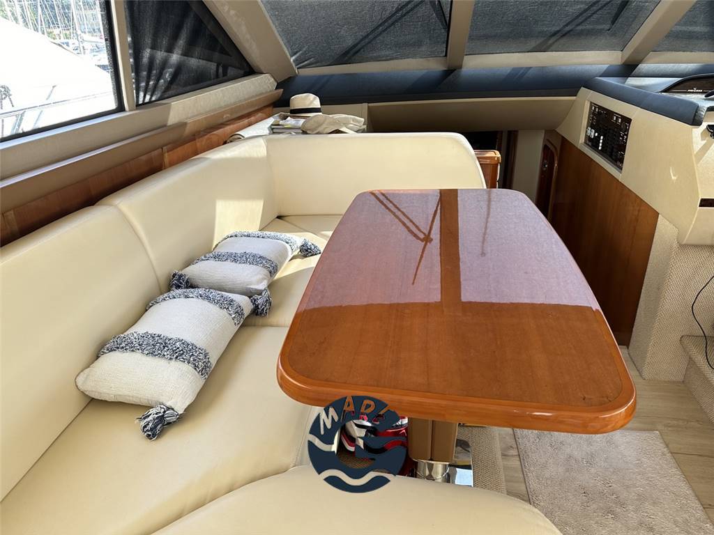 Interni in essenza di ciliegio splendidamente verniciato; salone con divano ad U, tavolo e lungo mobile di servizio a murata sinistra con Tv da 40", salottino pranzo con divano a C; sottocoperta cucina completamente attrezzata con forno, frigo, freezer e piastra in vetrocermaica a 4 fuochi; cabina armatoriale matrimoniale a centro barca a tutto baglio con bagno privato ensuite; cabina VIP a prora con letto matrimoniale; terza cabina con letti alla francese, secondo bagno completo di box doccia; cabina marinaio a poppa completa di bagno ed ingresso indipendente.