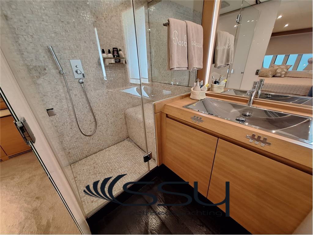 - Cabina vip matrimoniale a prua con bagno privato con box doccia e mosaico + TV LG smart + decoder Sky hd + sistema audio Denon Ceol + cordless Gigaset;