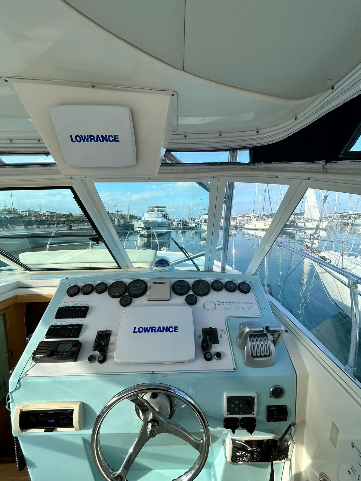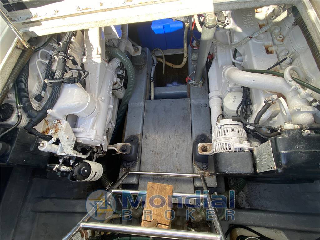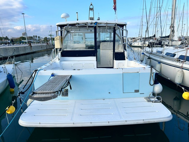 fisherman con 2 cabine bagno e doccia aria condizionata caldo freddo ampio pozzetto vasche del vivo mobile per la pulizia del pesce cucina esterna sotto il t top tavolo comodo per pranzo 6 persone ampia plancetta di poppa passerella idraulica t top autopilota plotter trasduttore manette elettroniche motori con doppio comando al pozzetto porta canne in acciaio integrato nel t top e a poppa cuscineria int esterna rifatta elica di prua generatore motori sbarcati e revisionati esternamente