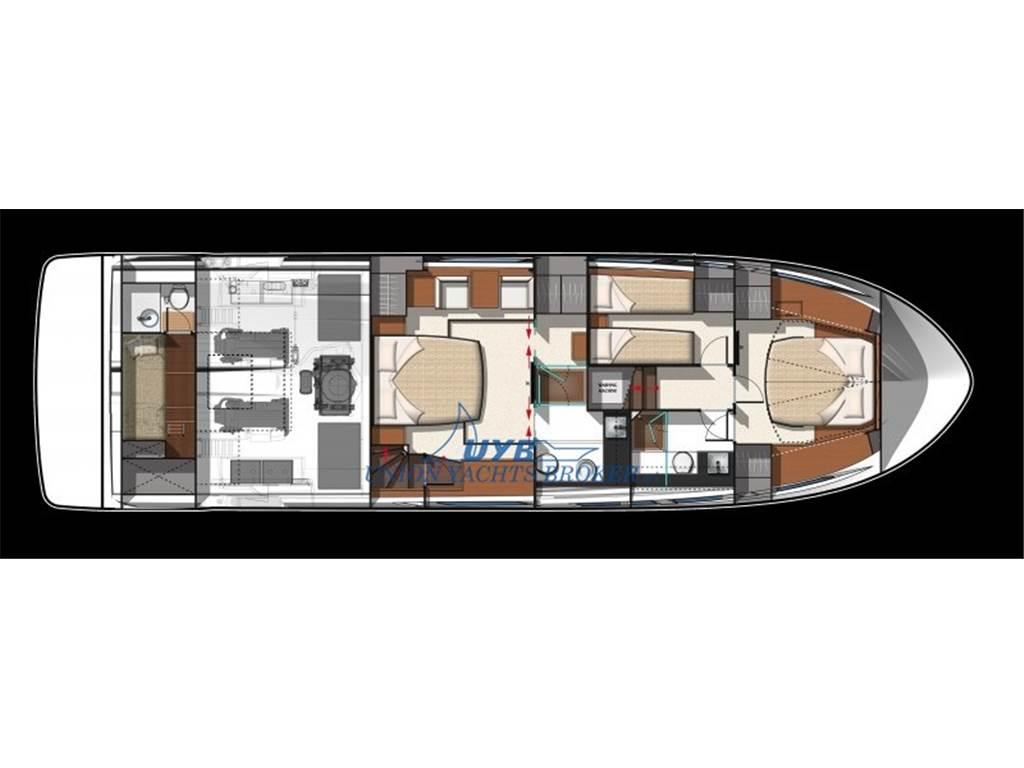 Cabina armatoriale a popppa con servizio privato, cabina doppia e matrimoniale a prua (letti separabili) con servizio in comune. A poppa è presente la cabina skipper con servizio.
