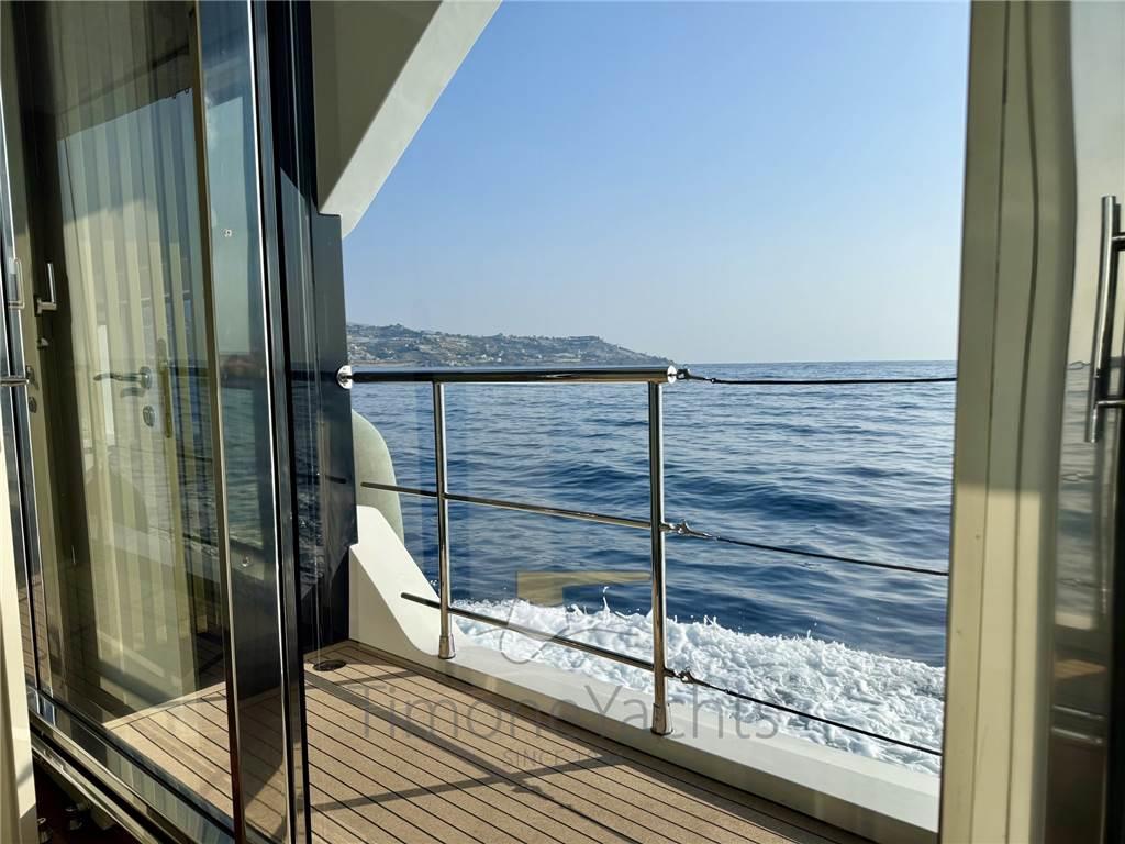 Una velocità di crociera continuativa di 18/19 nodi e una massimo di 25 nodi ti porteranno senza sforzo in tutto il Mediterraneo. La navigazione fluida da un flybridge straordinario, un unico ponte che si sviluppa tutto intorno al nucleo sociale dell'unità. Le zone pranzo, le aree prendisole, l'unità bar e i lussuosi mobili da esterno fluiscono insieme come raro trovare su uno yacht di queste dimensioni.