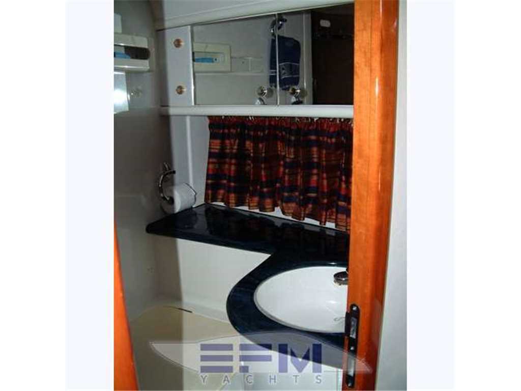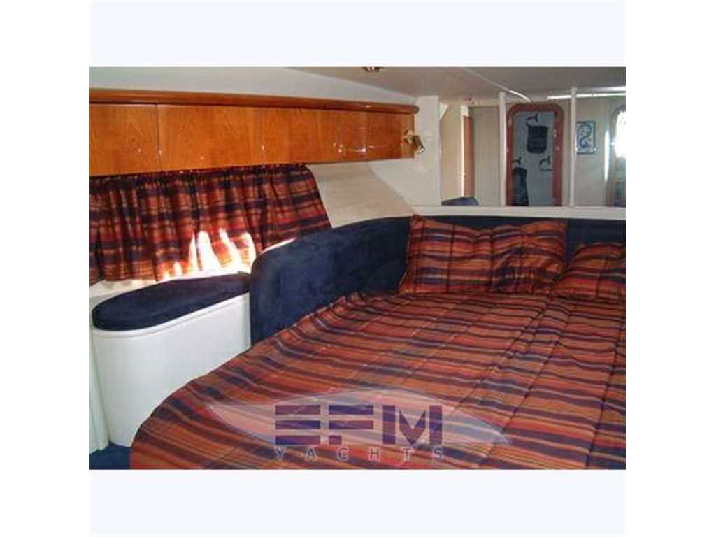 Classici interni in ciliegio lucido e pavimento in moquette - Al ponte inferiore a dritta il quadrato composto da una ampio salone con grande divano sagomato a C in pelle color panna e tavolo in teak a forma rettangolare abbattibile - Davanti al divano un mobile a murata con il tv lcd a parete e impianto con dvd e radio stereo con cd , che prosegue raccordato con la grande cucina a murata completa con 4 fuochi in vcr, forno micronde , lavastoviglie e frigo , pensili , dispensa e mobiletti per kambusa. Con entrata dal salone troviamo verso poppa a sx la cabina ospiti con 2 letti in piano mobile e armadio ,tv lcd a parete , e entrata privata al grande bagno completo con wc elettrico lavabo mobiletto e box doccia separato e con entrata anche esterna dalla dinette. A prua la spaziosa cabina Armatoriale con grande letto matrimoniale con tv lcd Sharp a parete e con bagno privato completo con wc elettrico lavabo mobiletto e box doccia separato - nel pozzetto troviamo il grande divano a C con tavolo in vtr a scomparsa nel divano e contrapposto il mobile cucina completo con lavabo, frigo a pozzetto, piastra elettrica e frigo . Sopra all' hangar ad apertura idraulica per il tender .. troviamo il grande prendisole e a terra nel pozzetto l' accesso alla sala macchine -
