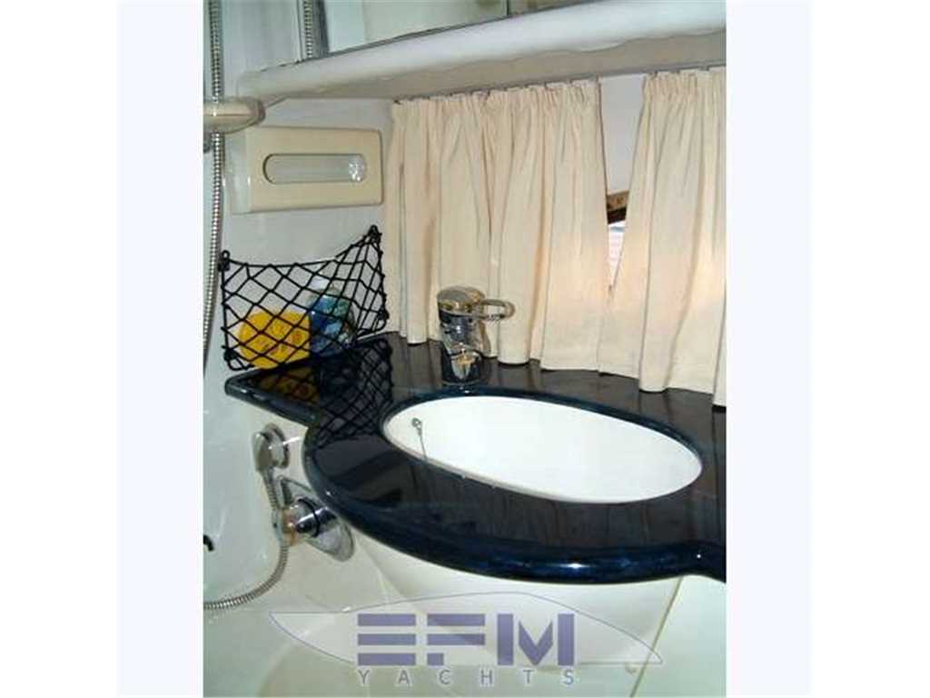 Classic high gloss cherry interior and carpeted floors - the lower deck on the starboard side the square consists of a large living room with large C-shaped sofa in cream-colored leather and teak table with rectangular folding - In front of the sofa a cabinet at side with lcd tv wall system with DVD and stereo radio with CD player, which continues connected with the great walled kitchen complete with 4 burners in vcr, microwave, dishwasher and refrigerator, cabinets, pantry and cabinets for Kambusa. Entrance from the living room is on the left aft guest cabin with two twin beds and wardrobe furniture, LCD TV on the wall, and a private entrance to the large bathroom with electric toilet and separate shower cabinet and with external entrance also from the dinette. At the bow, the spacious cabin with large double bed with Sharp LCD TV on the wall and a private bathroom with toilet sink vanity and separate shower - in the cockpit there is a large C-shaped sofa with table fiberglass hidden in the sofa and contrasted the Mobile kitchen complete with sink, cockpit fridge, electric hob and fridge. Above all 'hangar with hydraulic opening for the tender .. we find the great sun in the cockpit and on the ground 's access to the engine room -