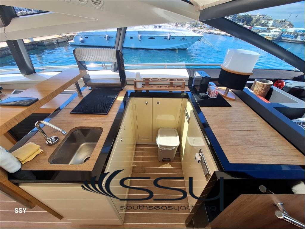 Il grande pozzetto di poppa si integra perfettamente con il salone grazie alla porta a scomparsa elettrica a sbalzo, creando un unico ambiente conviviale. Il tavolo telescopico del pozzetto consente di trasformare il divano in una spaziosa area prendisole. Completano l’equipaggiamento un transformer di poppa idraulico, garage e hard top elettrico.