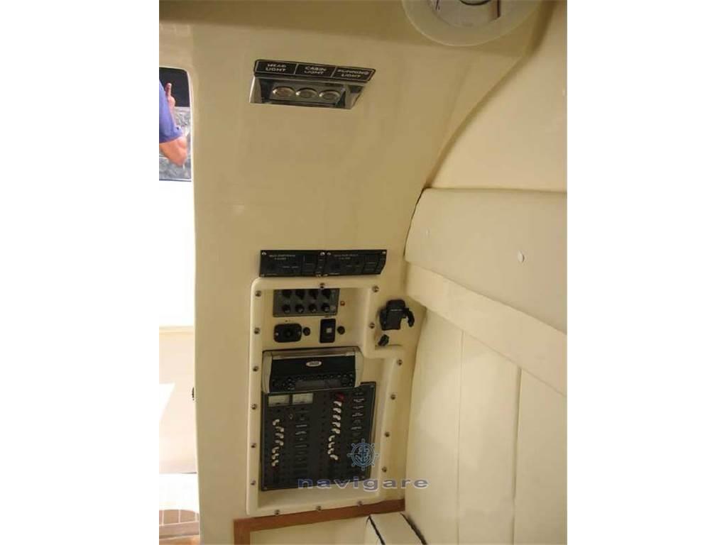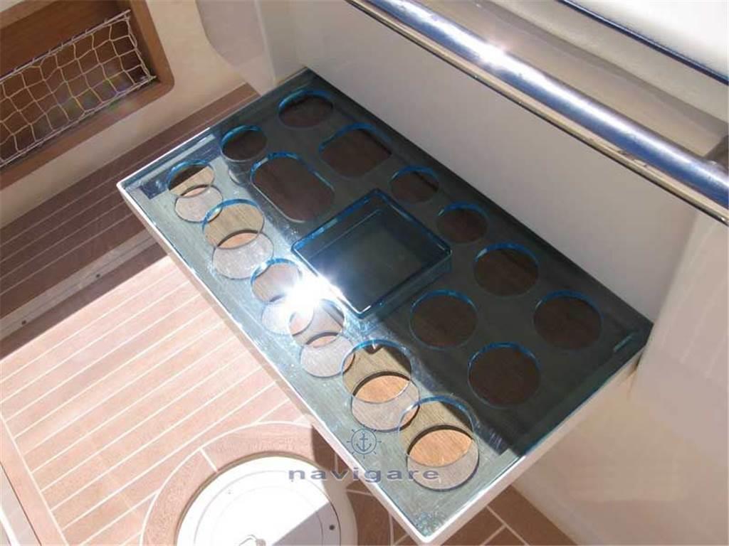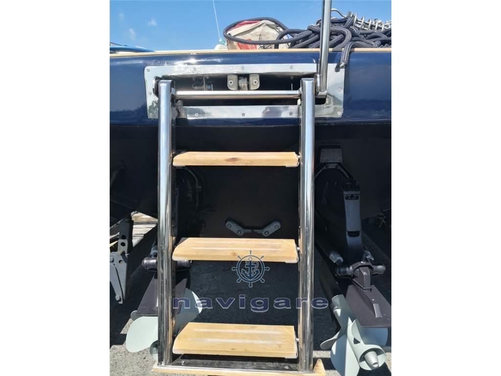 Allarme motore, Allarme sentina, Ancora, Autoclave, Batterie, Bussola, Camminamenti laterali in teak, Caricabatterie, Comando motori elettronico, Doccia esterna, Ecoscandaglio, GPS, Log, Luci di cortesia, Pilota automatico, Plotter, Pompa di sentina automatica, Pompa di sentina elettrica, Pozzetto Teak, Presa 220V banchina, Radar, Radio VHF, Salpa Ancore Elettrico, Scaletta da bagno, Tavolo pozzetto, Tromba