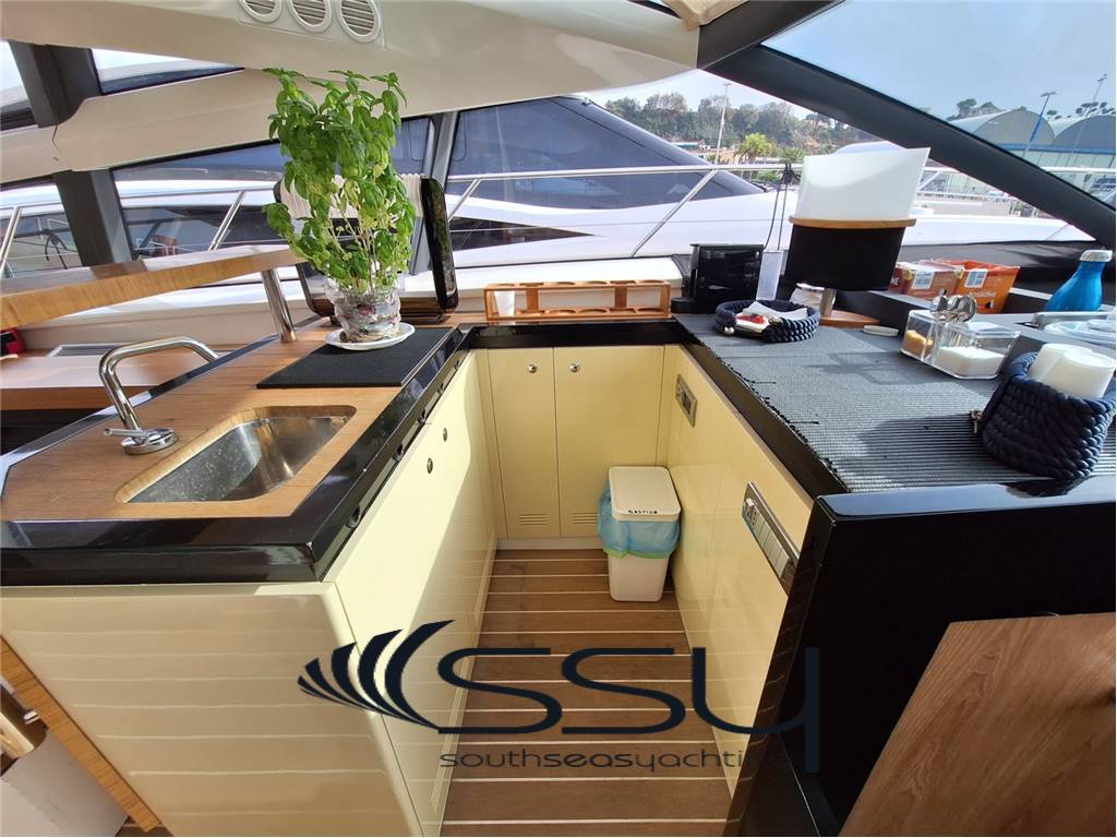 Il grande pozzetto di poppa si integra perfettamente con il salone grazie alla porta a scomparsa elettrica a sbalzo, creando un unico ambiente conviviale. Il tavolo telescopico del pozzetto consente di trasformare il divano in una spaziosa area prendisole. Completano l’equipaggiamento un transformer di poppa idraulico, garage e hard top elettrico.