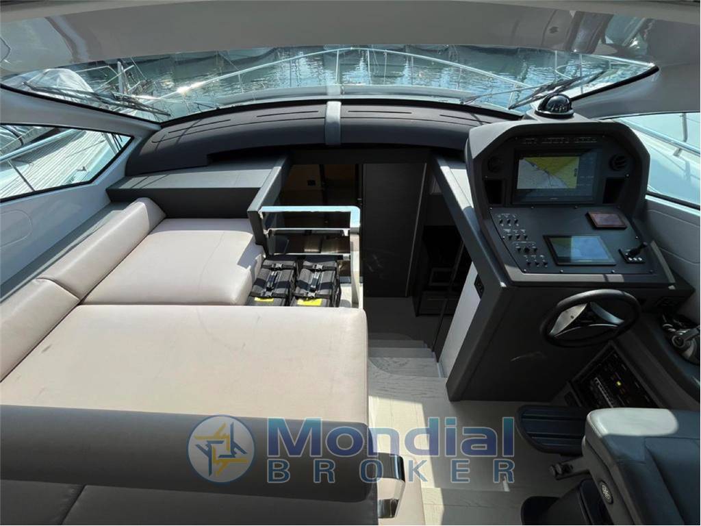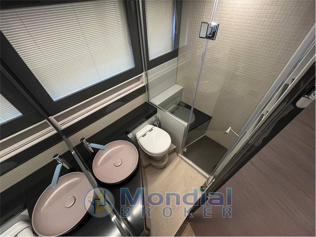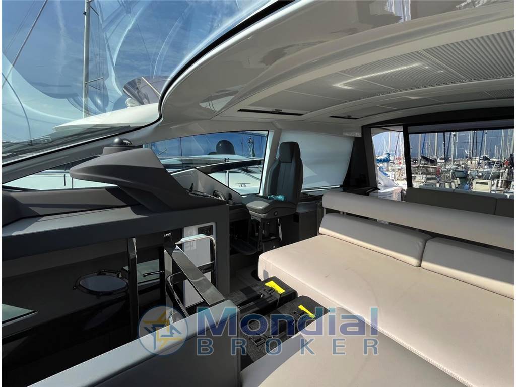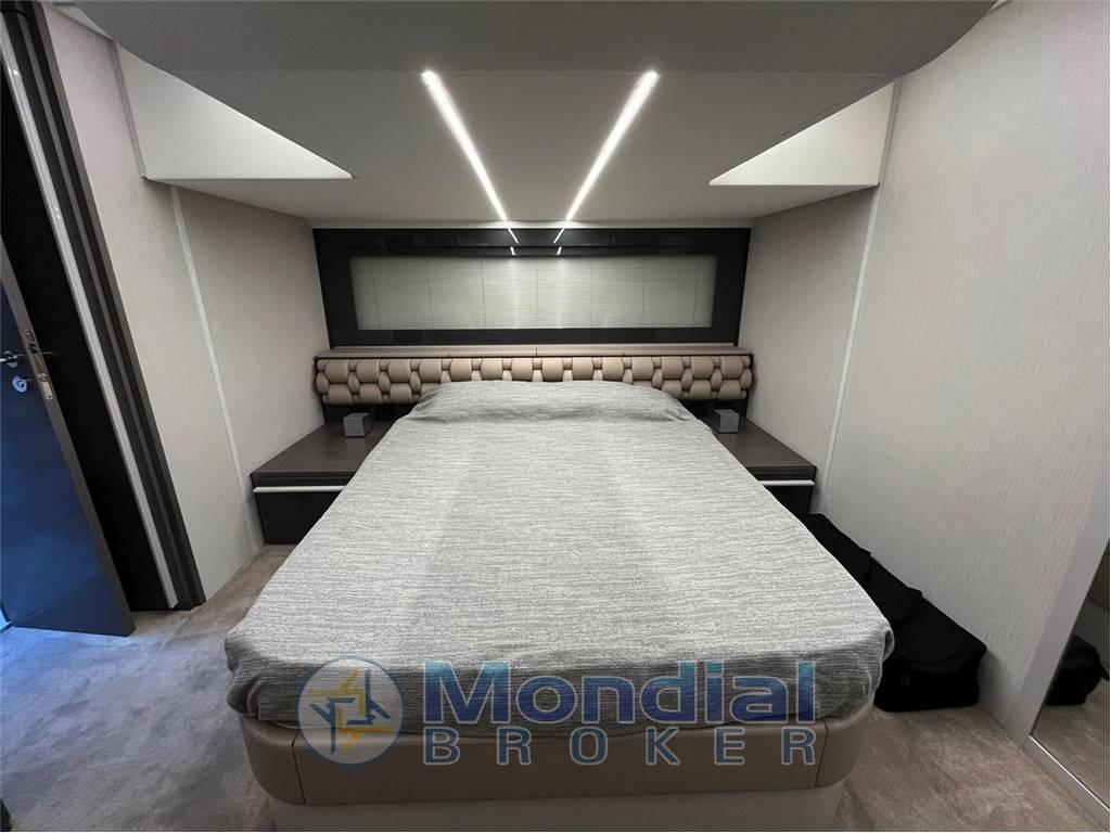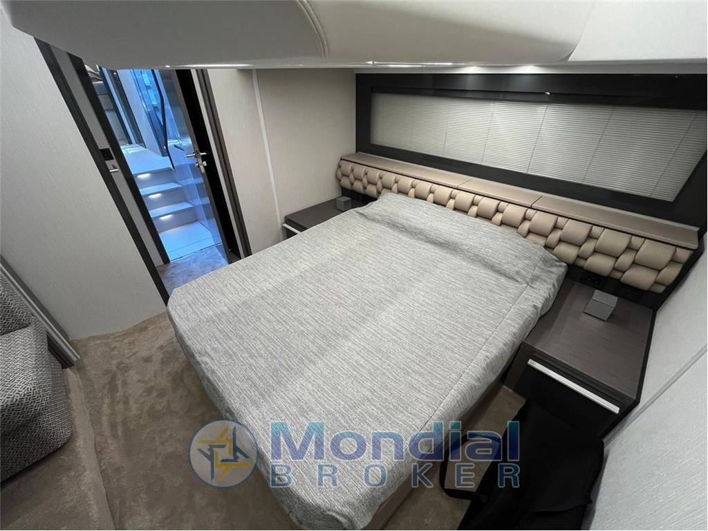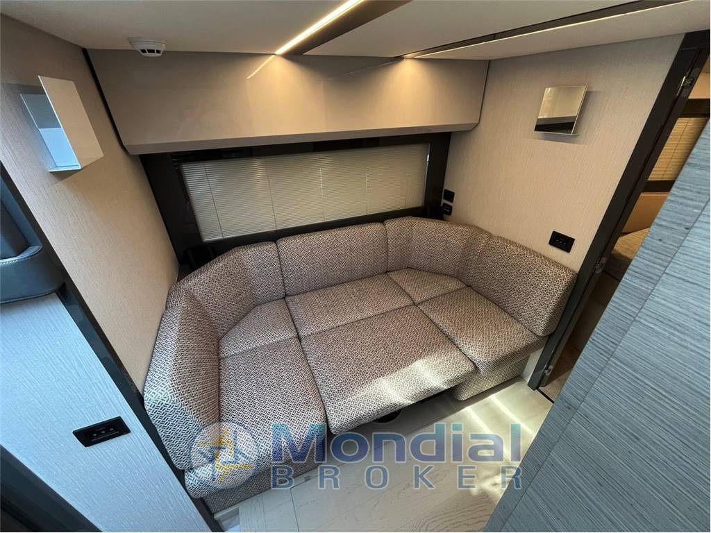 The cockpit seamlessly connects with the salon thanks to the signature electric glass door, creating an open and sociable environment ideal for entertaining. Below deck, the yacht offers two beautifully appointed cabins and two bathrooms, ensuring privacy and comfort for both owner and guests.