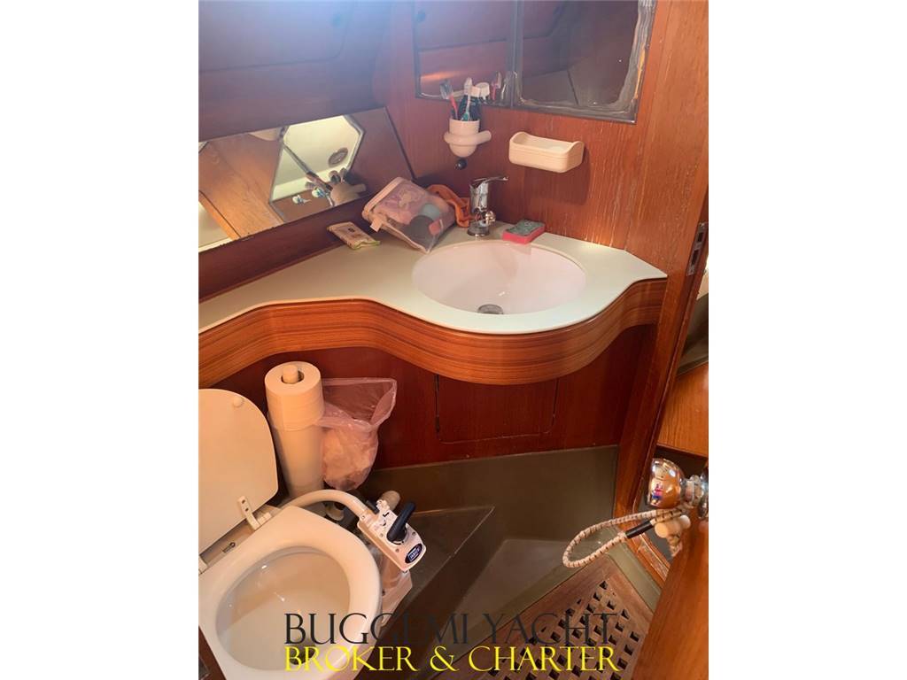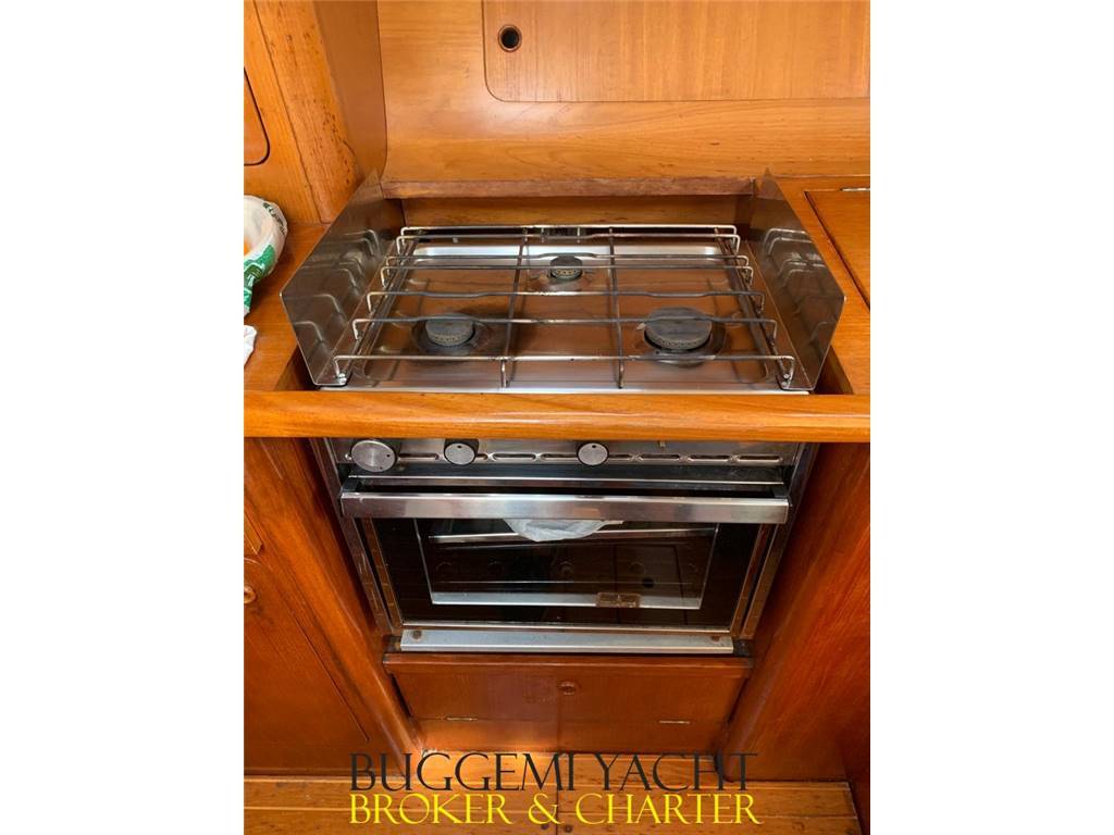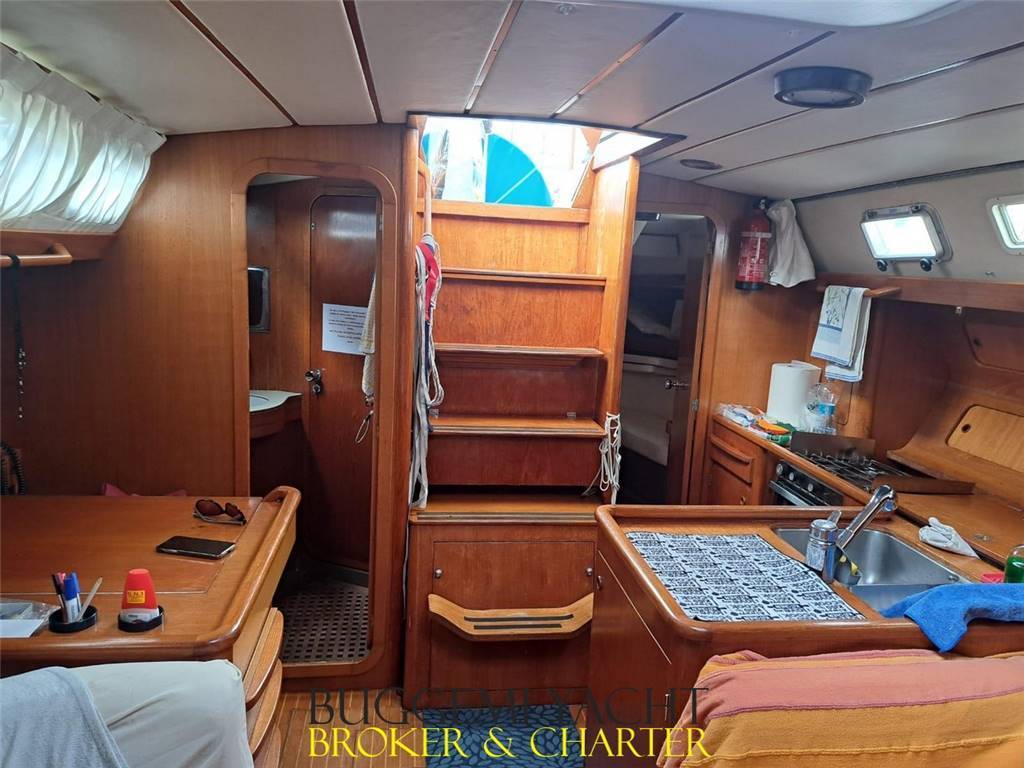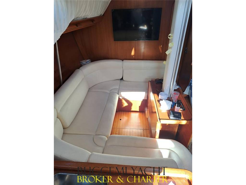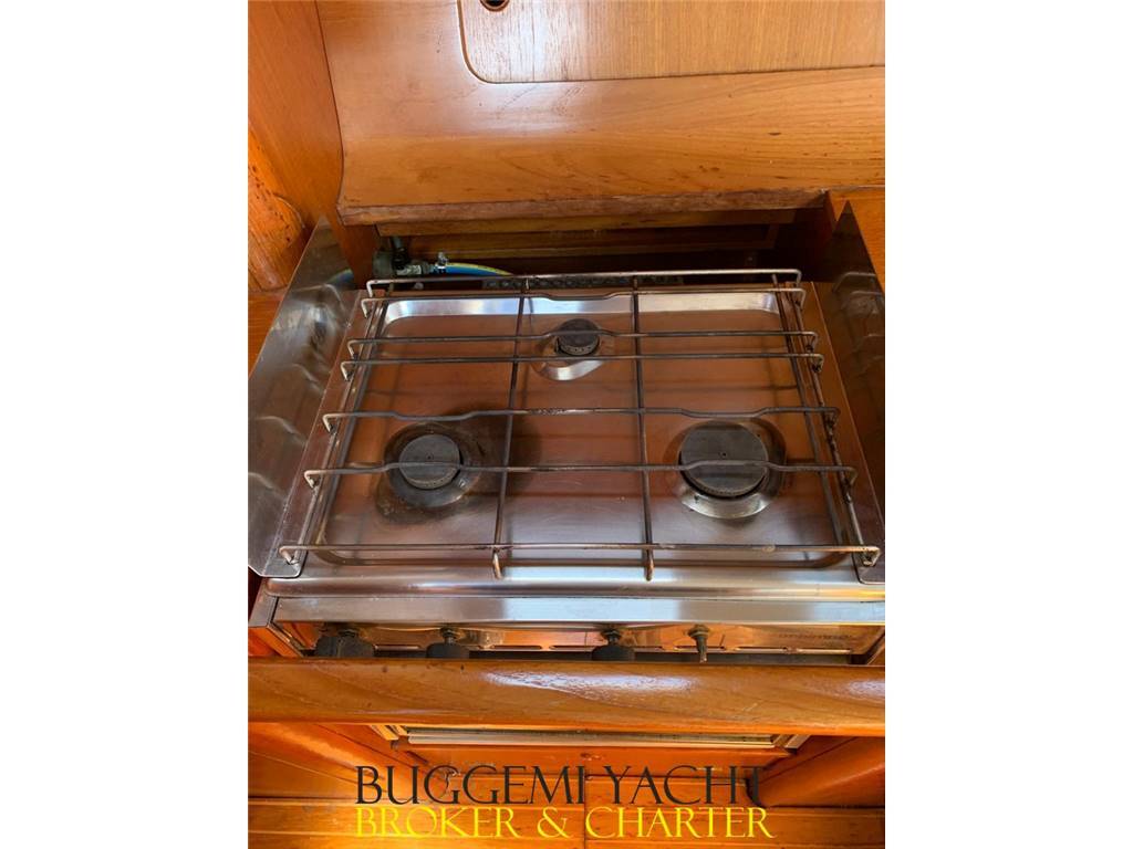 classica disposizione del modello GS42 con cabina doppia a prua e cabina armatoriale con letto matrimoniale a poppa, 2 bagni, cucina a L, 3 posti letto in quadrato, cucina gas a 3 fuochi, forno, frigo a pozzetto, finiture di pregio in legno massello teak originali ancora in buone condizioni, tutte le cuscinerie sono state rifatte nuove nel 2024, interni in splendide condizioni, pavimenti da riverniciare.