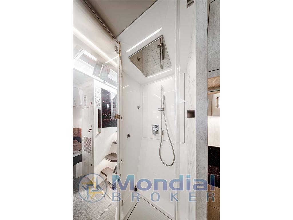 Questa barca nuova del 2026 monta 2 motori fuoribordo Mercury 400 HP nascosti sotto degli enormi prendisole. In configurazione Voyage con 3 cabine e 2 bagni. Il baglio è più stretto di un catamarano tradizionale, perché il progetto della carena è specifico per un’andatura planante, il che lo rende perfetto per ormeggiare in ogni marina, aggressivo con mare formato, molto comodo in ogni condizione.
