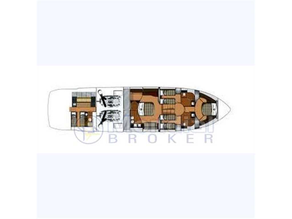 Cabine armatoriale, cabina vip, 2 cabine ospiti doppie, 3 toilettes, salone, cucina, cabina equipaggio con servizio.