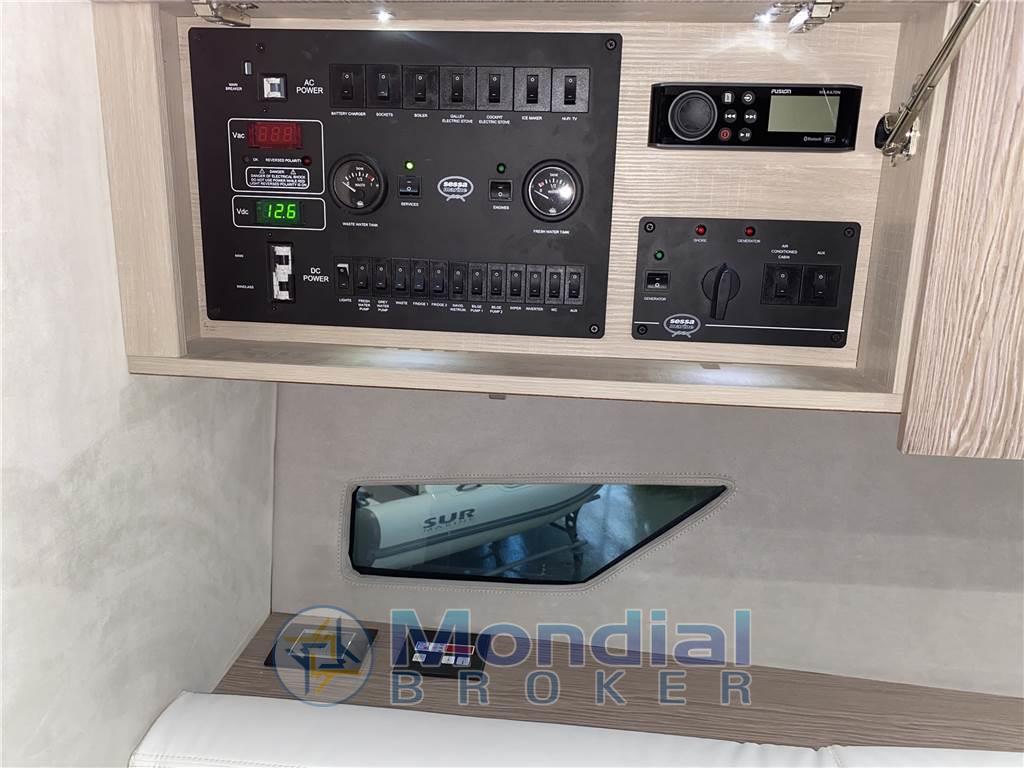 Allarme motore, Allarme sentina, Ancora, Apertura Vano Motore Elettrica, Autoclave, Batterie, Bussola, Caricabatterie, Comando motori elettronico, Contametri catena, Ecoscandaglio, Elica di prua - bow thruster, Flap elettrici, Hard top, Impianto antincendio, Indicatori Flaps, Joystick, Lavandino nel Pozzetto, Luci di cortesia, Passerella (idraulica a scomparsa), Piattaforma (affondabile idraulica), Plotter con antenna GPS, Pompa di sentina automatica, Pompa di sentina elettrica, Pozzetto Teak, Presa 220V banchina, Salpa Ancore Elettrico, Scaletta da bagno, Tavolo pozzetto, Tromba
