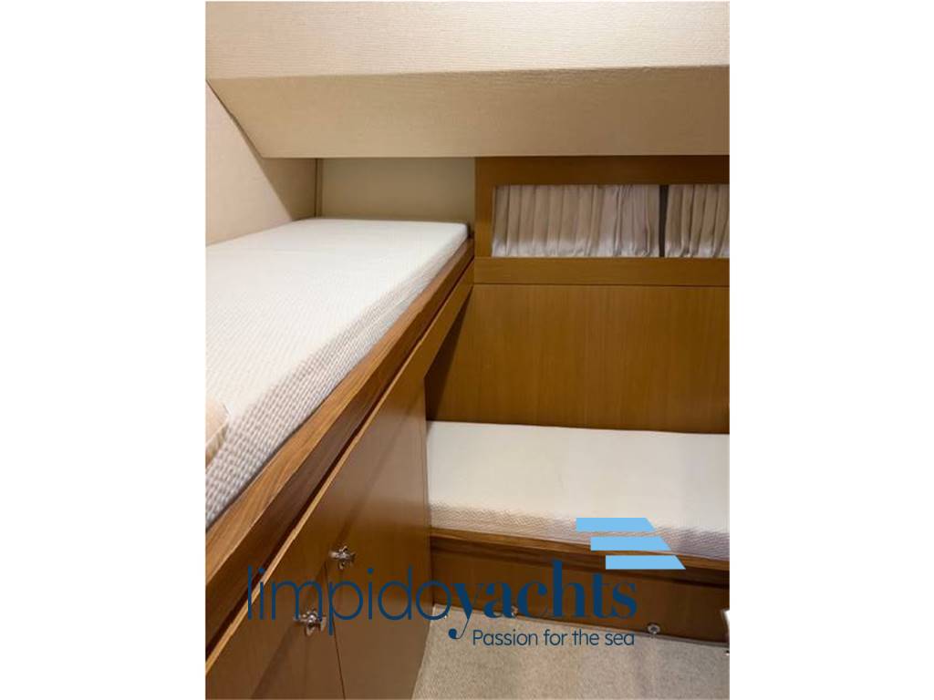 Dal pozzetto si accede sia all’interno del salone, attraverso una porta scorrevole, sia agli alloggi dell’equipaggio. Subito sulla destra, la zona living accoglie l’ospite con divani in pelle e un tavolino, mentre salendo due scalini si accede alla plancia di comando e alla dinette, con tavolo da pranzo per otto persone in cristallo e comodo divano. Una scala a murata, per non ostacolare la vista dal salone verso prua, dà accesso al fly. Di fronte all’area pranzo, è situata la cucina a vista, isolabile grazie a una porta scorrevole, con piano in granito nero Africa. Sottocoperta si trovano due cabine ospiti con letti gemelli, una delle quali è stata ampliata per permettere la disposizione dei letti a L. A prua la cabina Vip, con letto matrimoniale, due ampi guardaroba e un bagno dedicato dai pavimenti di teak e lavabi in marmo. Verso poppa la cabina armatoriale, che gode della soluzione “full beam” e delle due ampie finestre laterali con vista mare. Vista godibile sia dal divano semicircolare dal letto centrale. Il bagno, con doccia separata, ha il pavimento in teak e piani in marmo. Sul flying bridge la zona pranzo, con tavolo girevole e divano circolare, è completata da due ampi prendisole. Dietro la postazione di pilotaggio, con divanetto a tre posti e strumentazione a scomparsa, l’area frigo e piastra di cottura. Il flybridge può alloggiare anche una moto d’acqua mentre il tender trova posto sullo specchio di poppa che si apre ospitando all’interno un jet-ski a due posti.Interessante il divanetto ribaltabile nella plancia bagno, utile per la “vestizione” per le attività subacque.