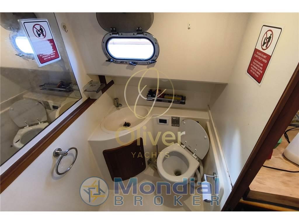 Il bagno è un vero punto di forza: locale separato, ben organizzato, con WC marino, lavabo e serbatoio acque nere, una dotazione indispensabile oggi e spesso assente su barche di questa categoria. Il boiler bivalente garantisce acqua calda sia in navigazione che in banchina, aumentando il comfort a bordo.