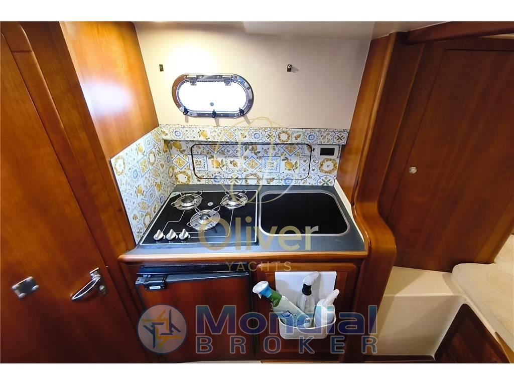 La cucina è funzionale e completa, con piano cottura, lavello, frigorifero e stivaggi adeguati per una vera crociera, non solo per uscite giornaliere. Tutto è disposto in modo pratico, senza sprechi di spazio.