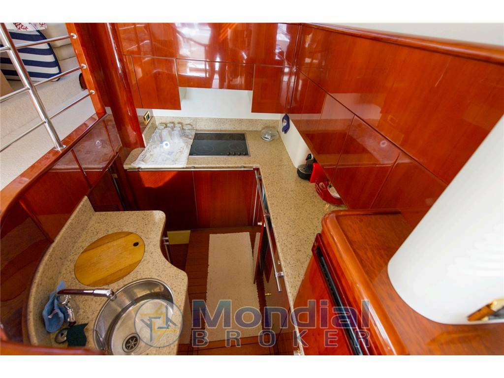 La cucina sottocoperta a tribordo è completamente attrezzata con doppi lavelli in acciaio inox, un piano cottura in vetro-ceramica, un microonde, un frigorifero, un congelatore e numerosi scomparti per lo stoccaggio.