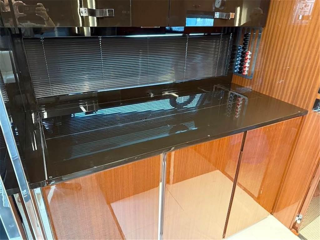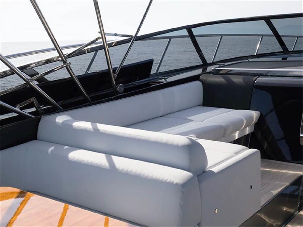 Attraverso la plancetta applicata sullo specchio di poppa che nasconde il garage per il tender, si accede al pozzetto di coperta caratterizzato da prendisole poppiero, zona dinette con divano a L lungo la murata di sinistra mentre sul lato opposto è stato collocato un mobile bar/cucina per i pasti all’aperto.