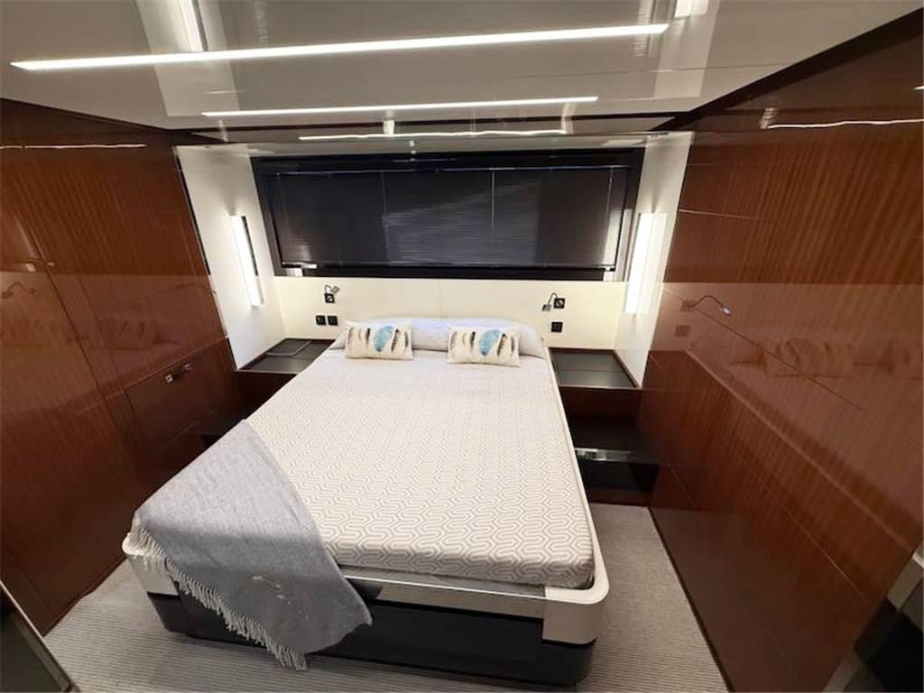 Sottocoperta vi è a dritta la zona dinette con divano e tavolo coffee, mentre sulla sinistra la cucina. La zona notte prevede 3 cabine con l’armatoriale a poppa che sfrutta tutta la larghezza della barca e dotata di un suo bagno en suite. La cabina Vip è a prua, anch’essa con il bagno dedicato. La terza cabina ospiti con letto a castello e bagno con doccia, questo bagno ha anche utilizzo day toilet.