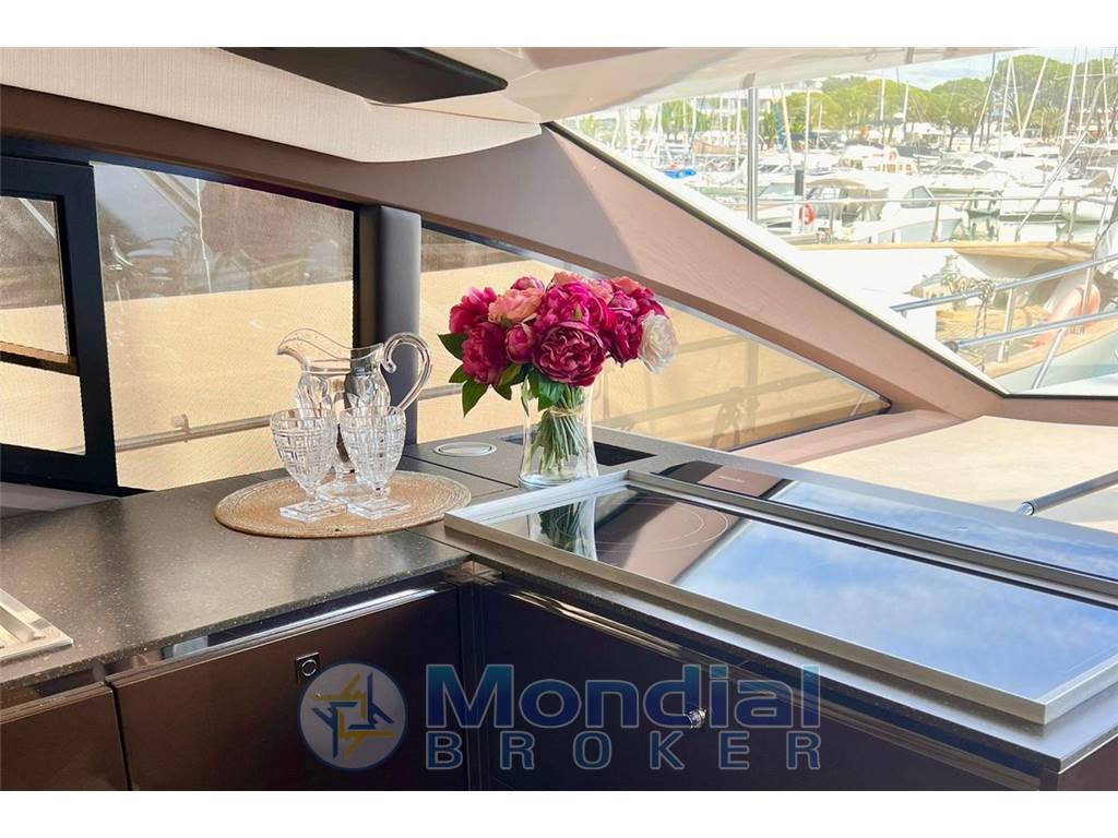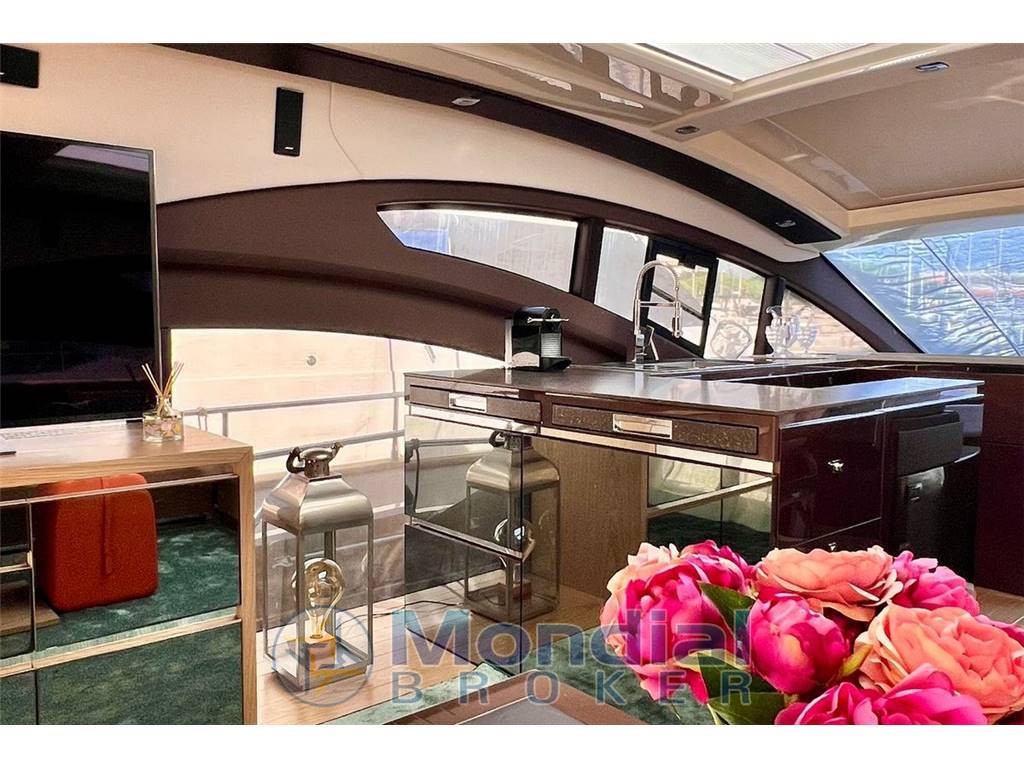 Inside, the Sessa C68 offers a bright salon opened by a fixed glass skylight and a wide sliding roof hatch. Furnishings include an L-shaped settee and a convertible table for six, plus a bar with sink, Gaggenau cooktop, retractable Miele extractor, and beverage refrigerator; twin electric helm seats are forward.