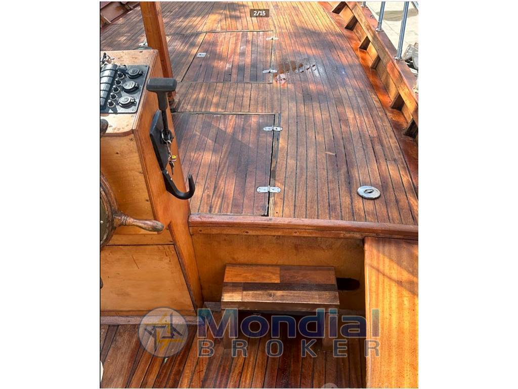 Finiture: teak sul ponte e nei bordi (falchetta, battifulmine), interni spartani ma curati – legno massello o compensato verniciato, ottoni per cerniere/ferramenta, niente lussi moderni tipo luci LED o AC.