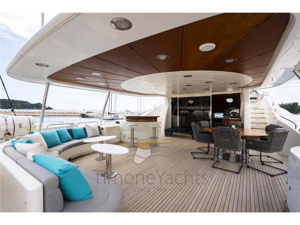 Camminamenti laterali in teak, Doccia esterna, Doppia timoneria, Elica di poppa - stern thruster, Elica di prua - bow thruster, Faro orientabile, Flap idraulici, Garage per tender, Gruette per tender su fly, Lavaggio catena, Luci subacquee, Passerella, Piattaforma, Porta ingresso, 2 Porta laterale, Pozzetto Teak, Presa 220V banchina, Presa acqua banchina, Scaletta da bagno, Stabilizzatori, Tavolo pozzetto, Tender, Tientibene con cancelletti, Tromba, Winch tonneggio di poppa, Winch tonneggio di prua.