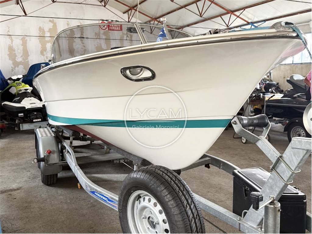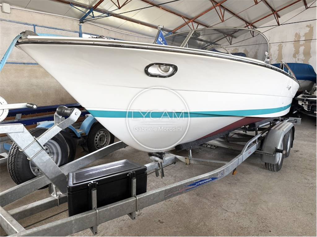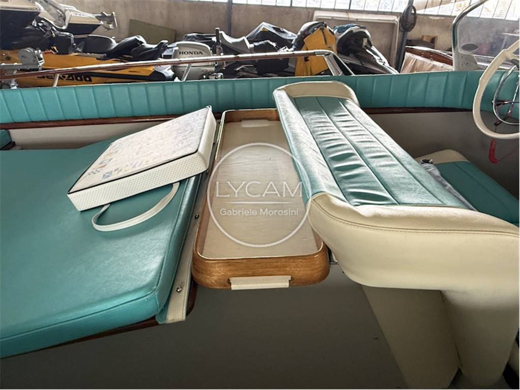 Progettato dall’Architetto Barilani per essere realizzato in vetroresina, mantiene però alcuni dettagli in mogano come i corrimano laterali e il ripiano porta oggetti alle spalle della seduta di pilotaggio conferendo alla barca una maggiore ricercatezza.