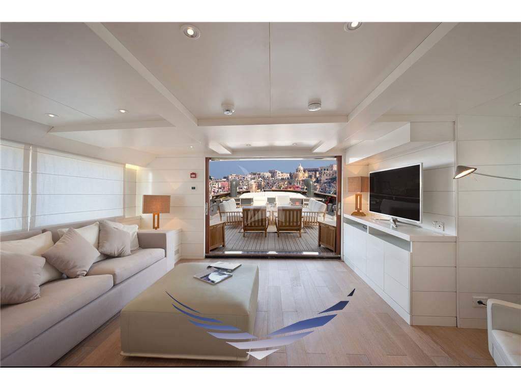 Il ponte superiore ospita una suggestiva zona relax adiacente alla plancia di comando, dotata di scrivania, libreria e un comodo divano, ideale per momenti di lettura o lavoro in totale tranquillità. All’esterno è presente un’area aperta, parzialmente coperta da tendalini, con tavolo per pranzi all’aperto e sedute prendisole.