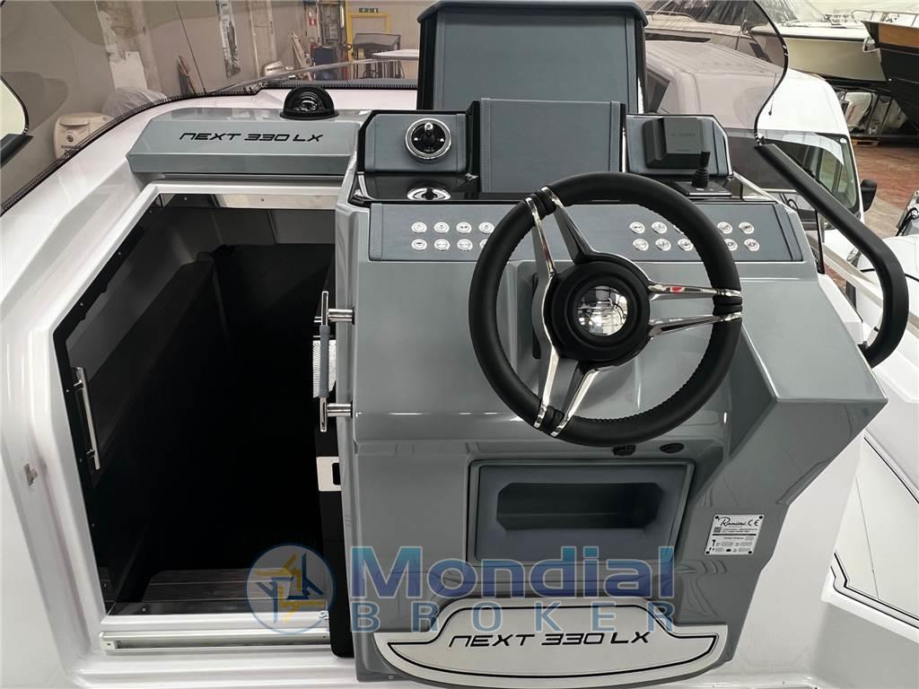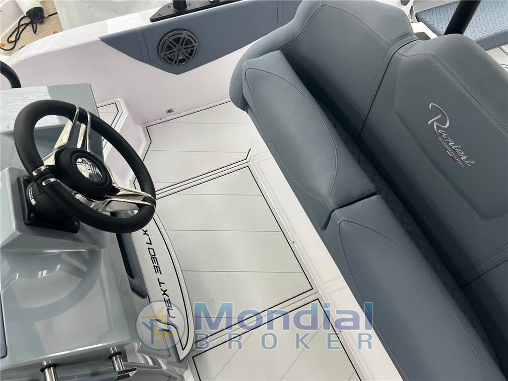 Ranieri 330 LX del 2026 con due Honda da BF 300 V8 White , comodo e di grande vivibilità per 4 persone la zona cabina/notte Questa unità in pronta consegna è stata completamente preallestita Full Optionals e preventivata con la doppia motorizzazione HONDA BF 300 V 8 White . Cabina ospiti e dinette di prua trasformabile ; WC elettrico con lavello in locale separato / serbatoio acque nere, Tessuto Luxury, 8 oblò Radio Stereo con 6 altoparlanti , prendisole di poppa elettrico.