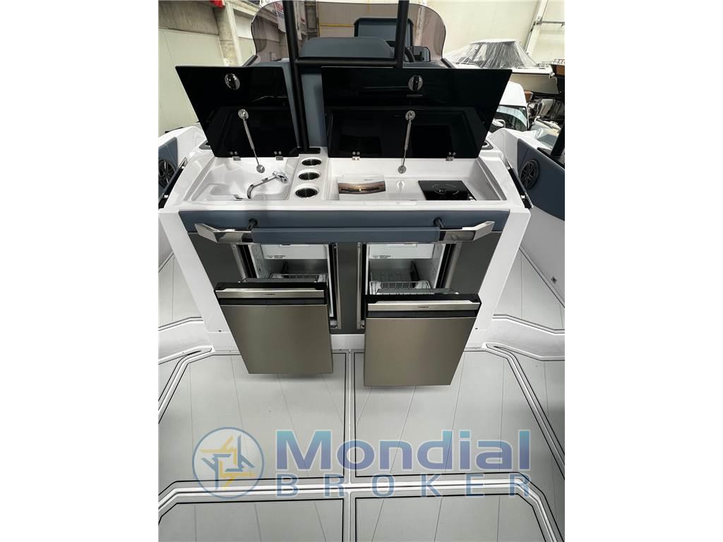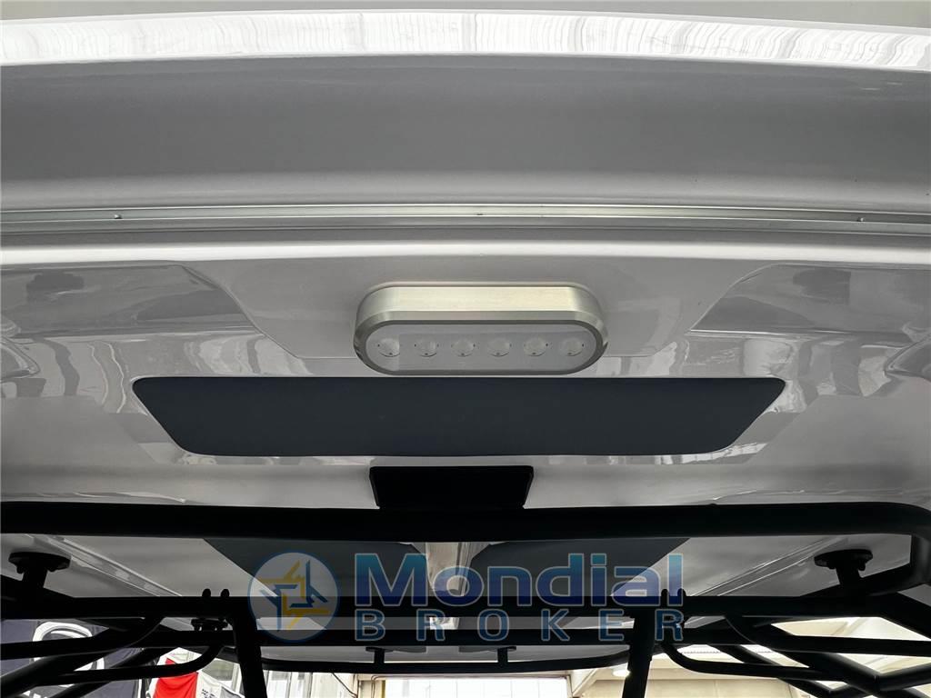 GPS/ECO , Verricello elettrico, Aria condizionata 12 V., Impianto per batteria addizionale, Timoneria idraulica , Ancora in acciaio inox, Elica di prua, doppia pompa sentina, Kit Led int/est, Kit videocamera frontale, Presa banchina 220 v con carica batterie,Doppio Frigorifero inox est. Fornello ad induzione con inverter, Impianto doccia con autoclave Sedute laterali a ribalta, Sea Deck grigio in tutta la coperta, cuscinerie complete, Fly Top Bianco in VTR con prolunga di poppa, Parabordo in acciaio inox, Sea deck , Tappezzeria est. Luxury, Consolle grigia.
