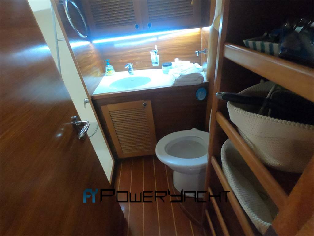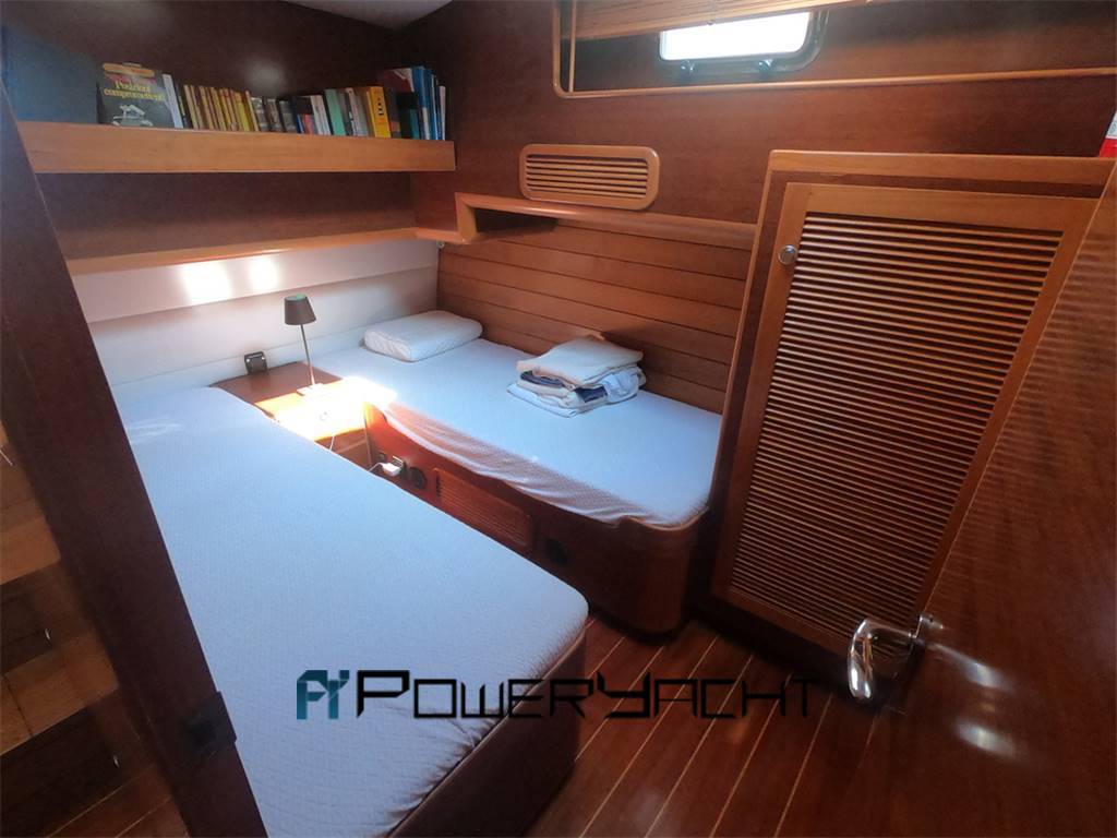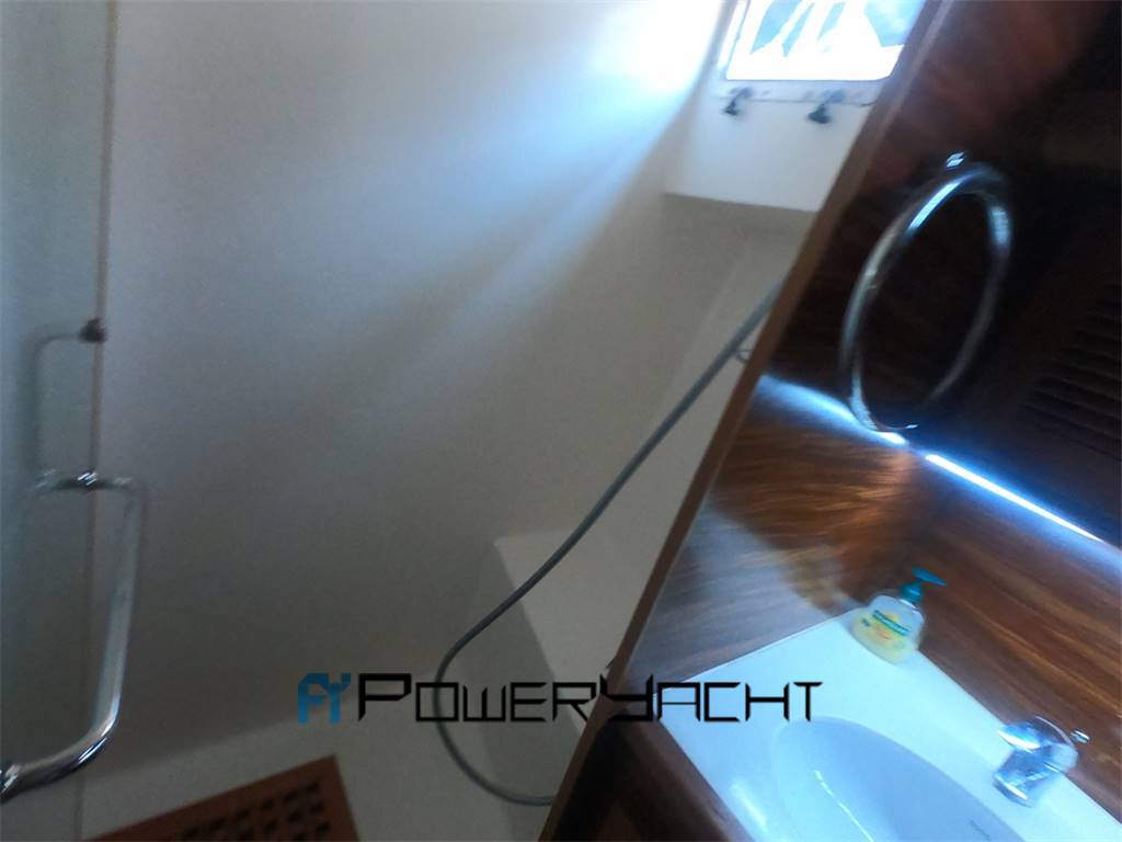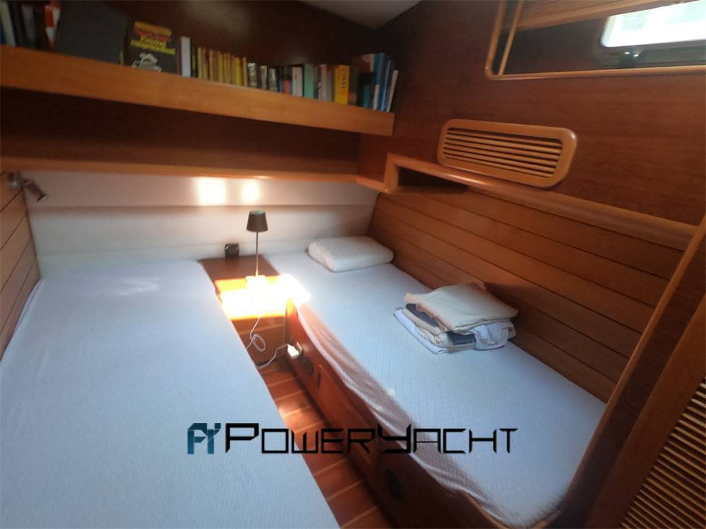 Cabina armatore a prua, con letto doppio centrale, e bagno privato a sinistra con camera doccia. Due cabine ospiti a centro barca; una con due letti singoli a sinistra, la terza con letto alla Francese a dritta. Secondo bagno ospiti a dritta anche questo con camera doccia.
