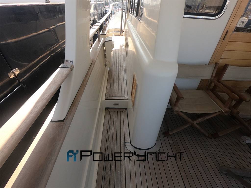 Esterni con pozzetto a poppa grande con divano, che con tavolo e sedie libere diventa una zona pranzo o di relax. Zona prendisole a prua. Passaggi laterali spaziosi e profondi da vera navetta con doppie porte laterali (sinistra-destra). Plancia bagno lungo con spazio per tender.