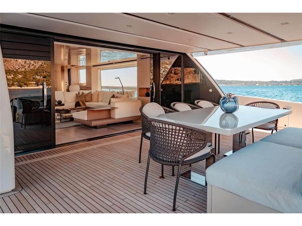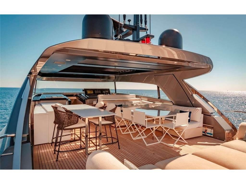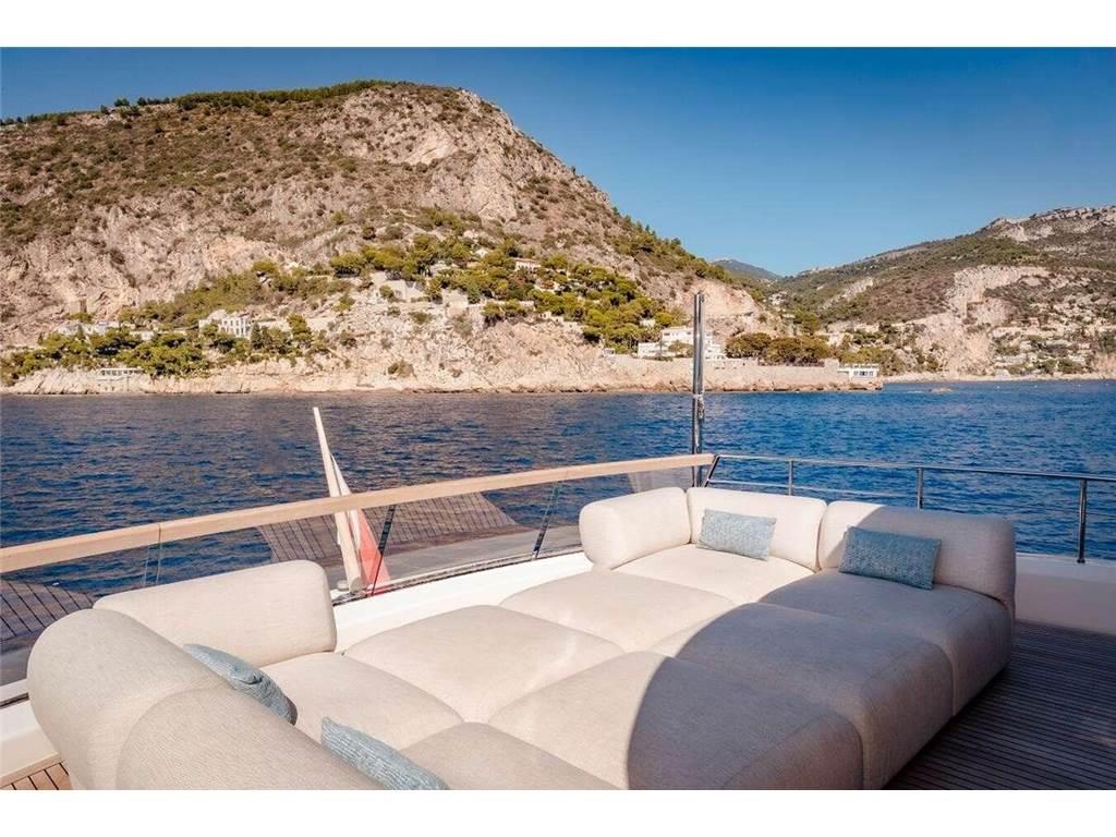 Allarme motore, Allarme sentina, Ancora, Autogonfiabile, Camminamenti laterali in teak, Doccia esterna, Doppia timoneria, Elica di prua - bow thruster, Gruette per moto d'acqua, Gruette per tender, Luci di cortesia, Luci subacquee, Passerella, Piattaforma, Pompa di sentina automatica, Porta ingresso, Porta laterale, Pozzetto Teak, Presa 220V banchina, Presa acqua banchina, Salpa Ancore Elettrico, Scaletta da bagno, Stabilizzatori (FIN ZERO SPEED), Tavolo pozzetto, Tender (And Jetski), Tromba, Winch tonneggio di poppa, Winch tonneggio di prua.