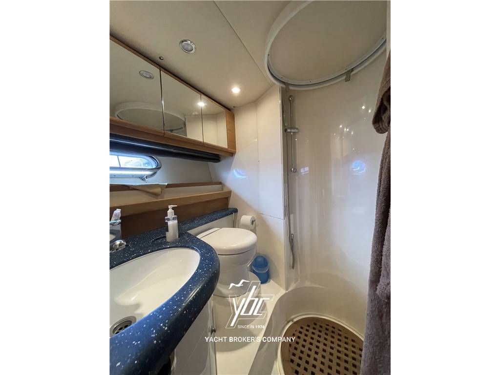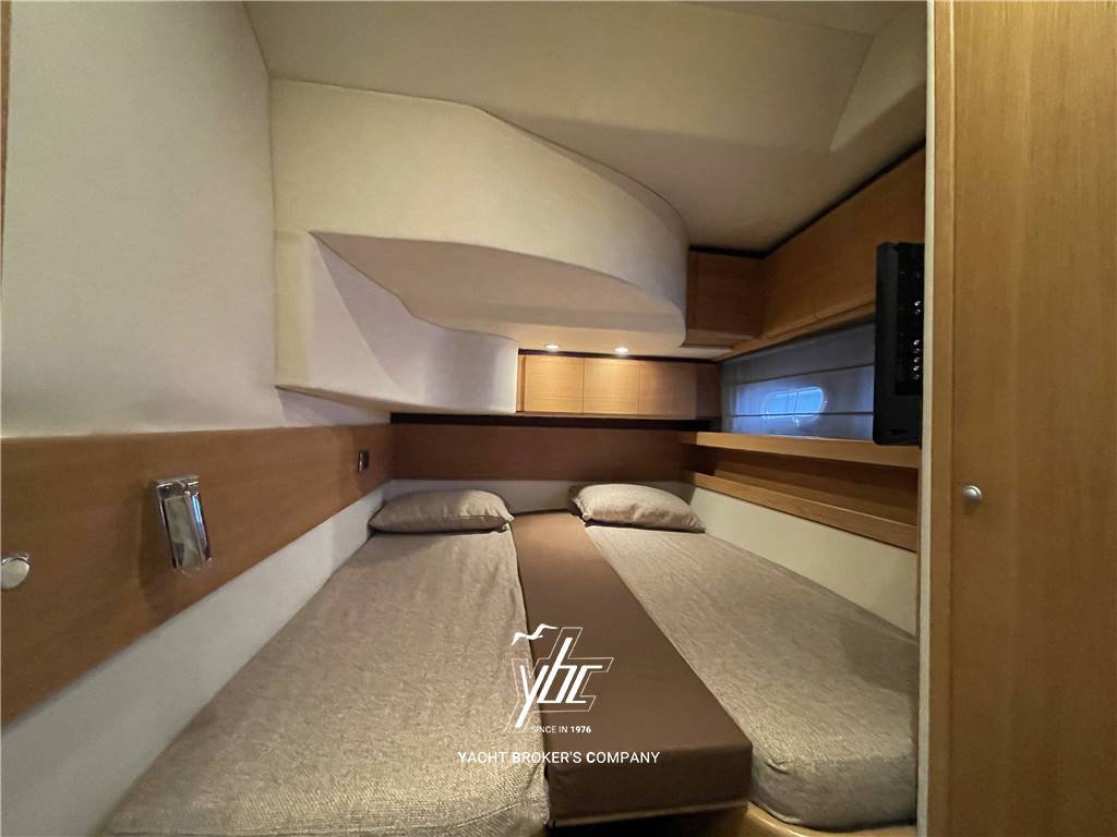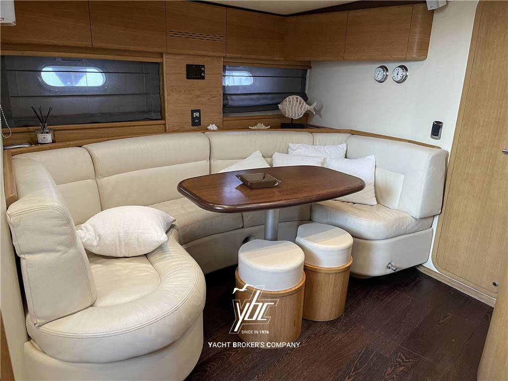 Grande plancetta di poppa per alloggio tender o moto d'acqua - Pozzetto composto da due ambienti separati. Accedendo a bordo sul lato sinistro si trova un grande prendisole trasformabile in zona conviviale con tavolo elettrico a scomparsa rivestito in teak - Più avanti, sempre sul lato sinistro, trova posto una comodissima dinette con tavolo pranzo, circolare, per 6/8 persone. Sul lato di dritta, dietro il divano della timoneria e posizionato il mobile completo di lavello, frigo e piano cottura ad induzione a due elementi. Accesso alla cabina marinaio completa di un letto, wc e lavello. Accedendo sotto coperta sul lato sinistro, si trova un grande divano con ulteriore tavolo pranzo centrale per 6/8 persone. La cucina, di fronte è completa di frigo/freezer a colonna, piano cottura ad induzione a 4 fuochi, lavello e forno microonde. A prua si trova la cabina armatore con armadi, ampie cassettiere, bagno dedicato completo di box doccia separato. Completano l'imbarcazione due cabine ospiti trasformabili in matrimoniali e secondo bagno.