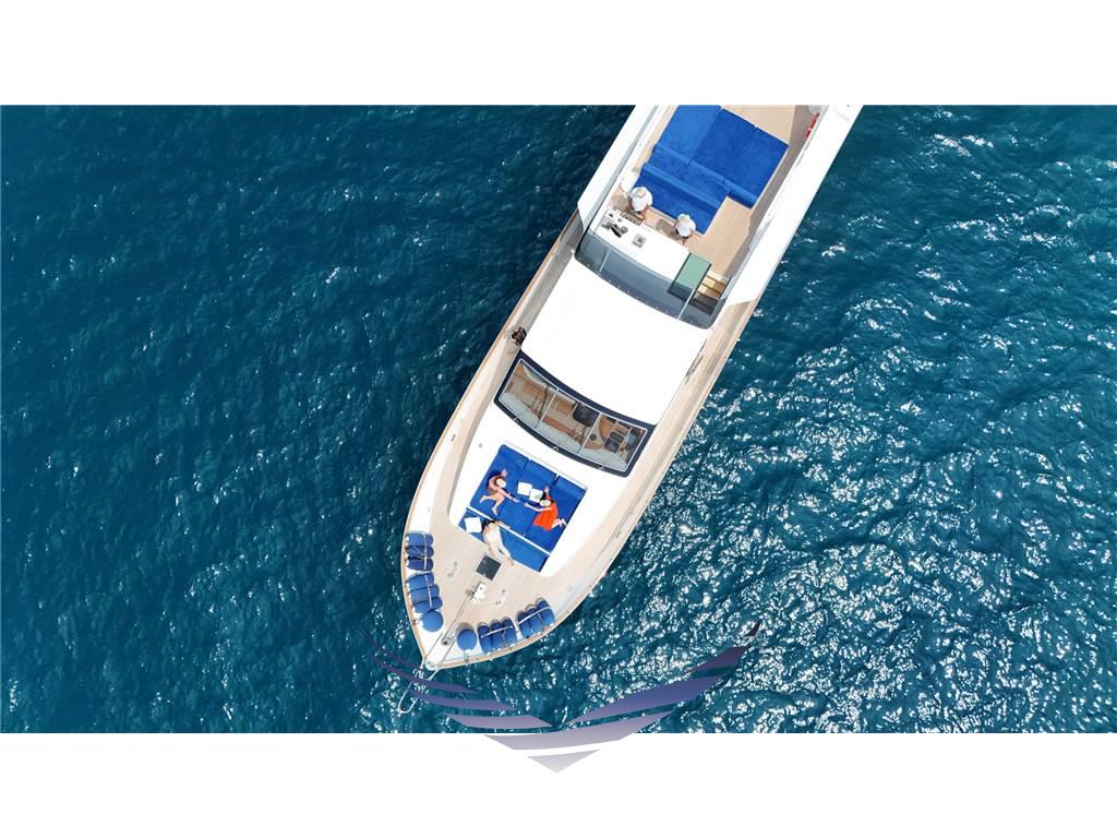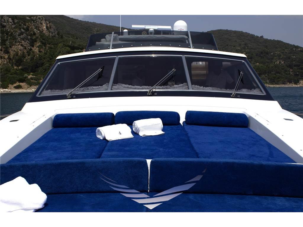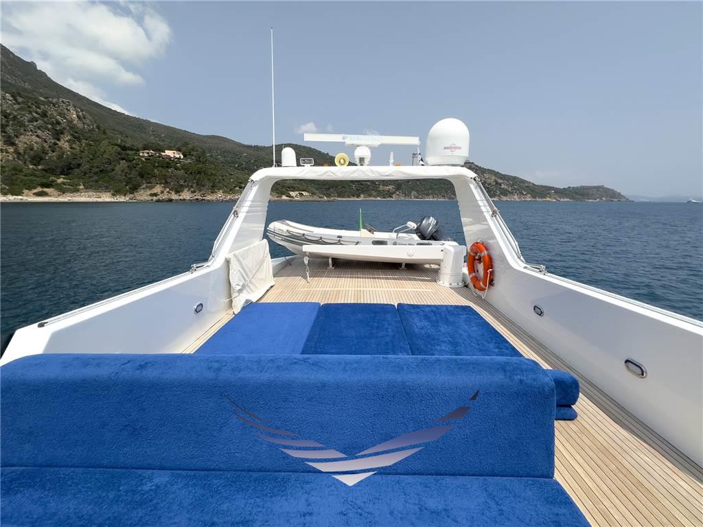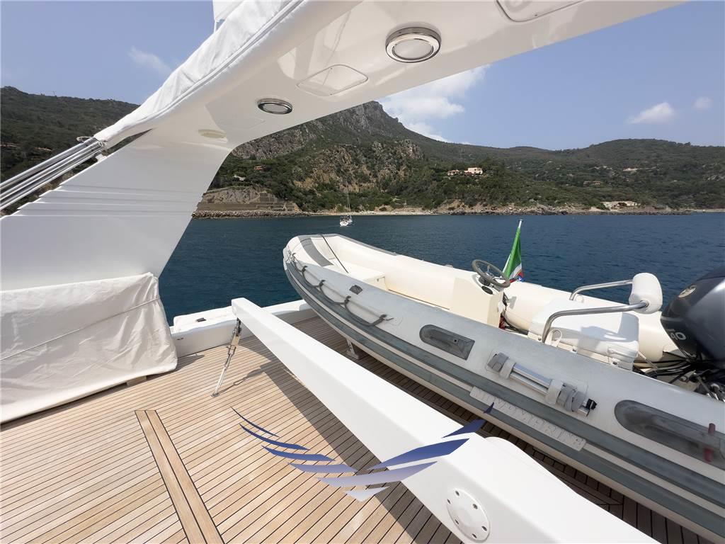 Ancora, Camminamenti laterali in teak, Doccia esterna (calda e fredda), Doppia timoneria, Elica di prua - bow thruster, Gruette per tender su fly, Luci di cortesia, Passerella, Presa 220V banchina, Presa acqua banchina, Scaletta da bagno, Stabilizzatori (Seakeeper 16), Tavolo pozzetto, Tender (Yamaha 40 cavalli, Novamarine 5 metri).