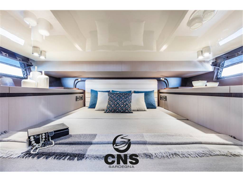 Cabina di poppa con letto matrimoniale completo di materasso, mobili con interruttori luci lettura e presa 230V, mobili in essenza, oblò apribili e illuminazione led.