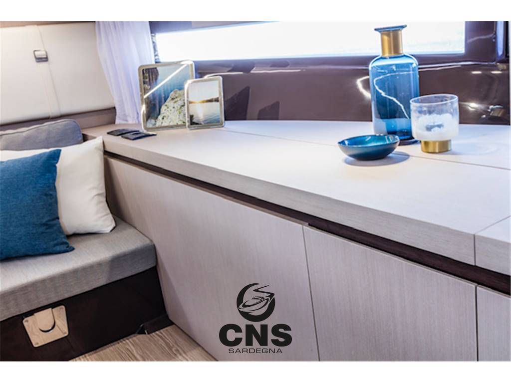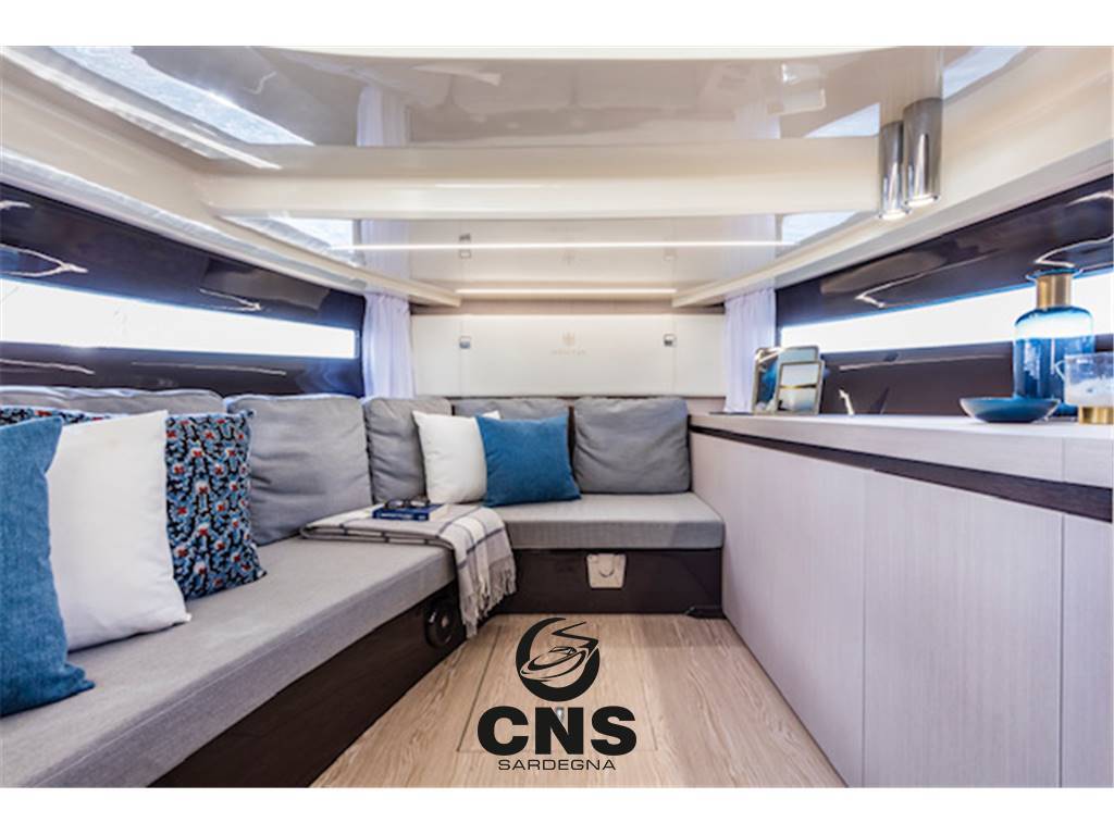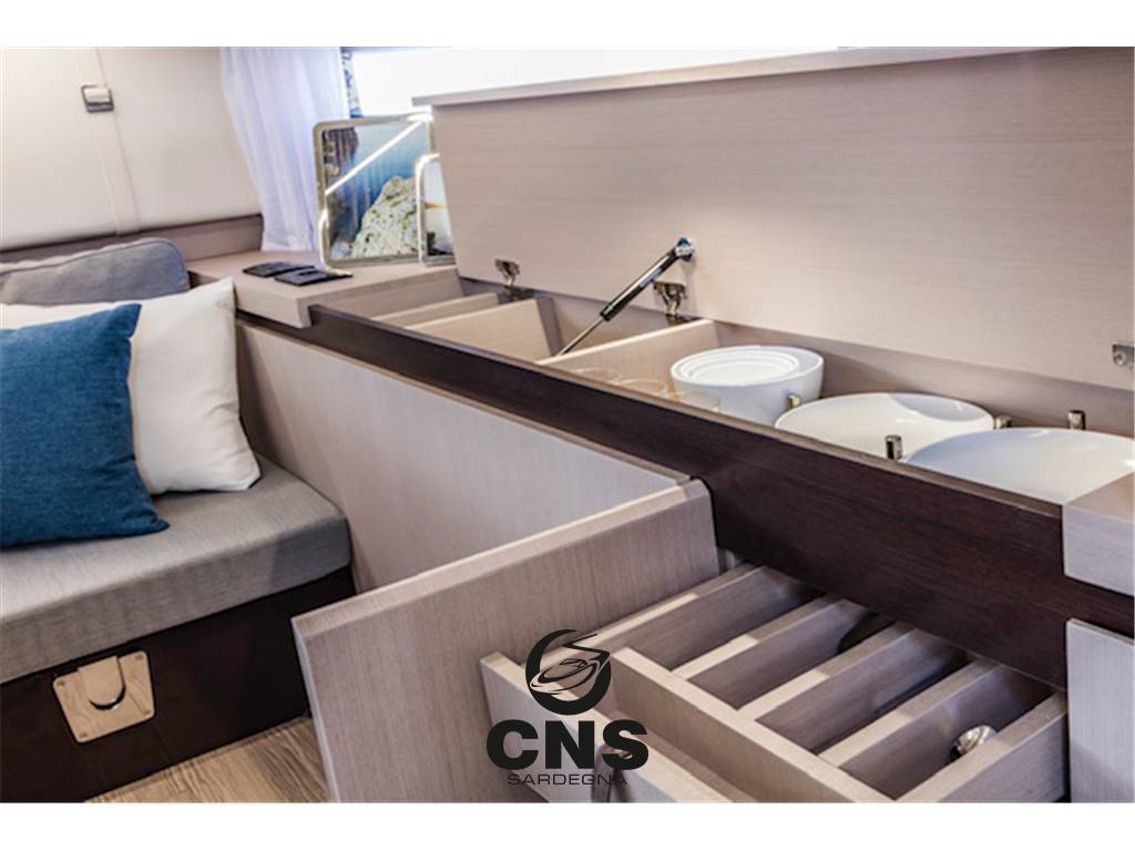 Cabina di prua con divano dinette e gavoni sottostanti trasformabile in letto, tavolo dinette, frigorifero 85 lt, mobili in essenza, oblò apribili, illuminazione led, prese 230V, pannello elettrico principale con sezione 12V e 230V.