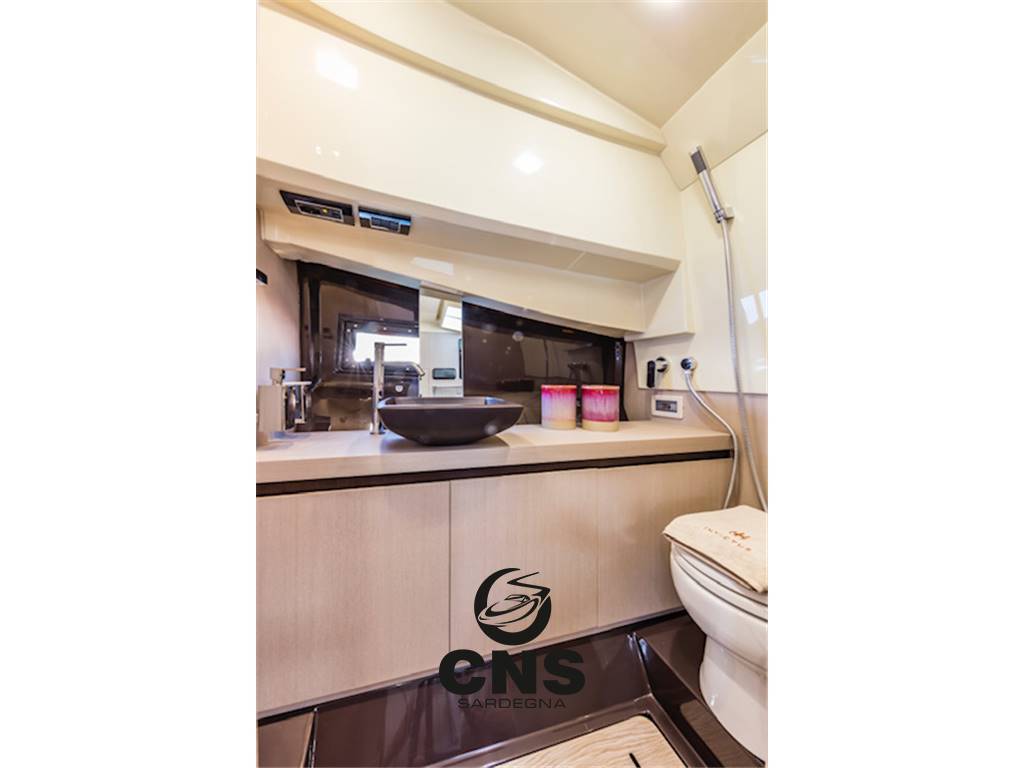 Bagno con porta e mobili in essenza, wc con lavaggio ad acqua dolce, doccia, lavello con miscelatore, presa 230V con protezione magnetotermica differenziale, carabottino pavimento doccia in essenza, doccino con saliscendi, faretti stagni a led, complementi d'arredo bagno, oblò apribile.