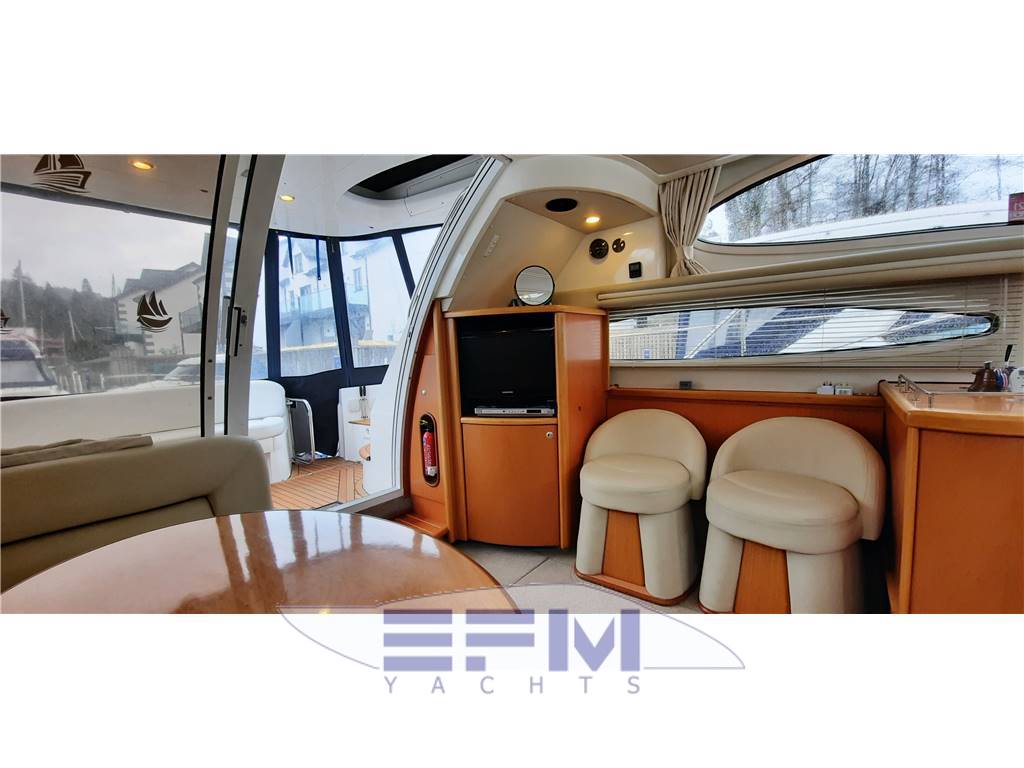 Posto di pilotaggio interno: desk computer, timoneria a ruota in acciaio inox e teak con idroguida, comandi vari (verricello, flaps, tergilavavetri, vetri laterali apribili, luci navigazione e ricerca, lavacatena, tromba, estrattori e ventilatori sala macchine. Strumentazione elettronica completa Raytheon Raymarine doppia anche sul Fly interfacciata: display multifunzione Autohelm Tridata st 600 , radiotelefono 2 VHF , 2 GPS, Plotter cartografico, autopilota, angolo barra, bussola magnetica, log, eco, pannello sinottico strumentazioni e indicatori motori, strumentazione VDO, forno micronde , Tv salone - impianto Tv - radio stereo cd Sony + dvd - manette elettroniche Volvo - computer gestione motorizzazioni - Comando elica di prua doppio anche sul Fly - Impianto 220/24/12 v -