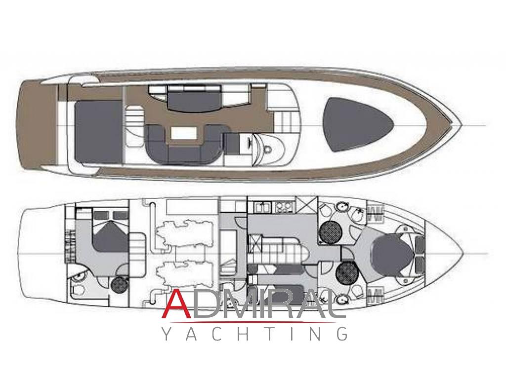 2 Matrimoniale italiana, 1 Doppia in piano, 1 Cabina equipaggio, 1 Toilette, 1 Dinette, 1 Cucina, 1 Toilette equipaggio, 2 Toilette