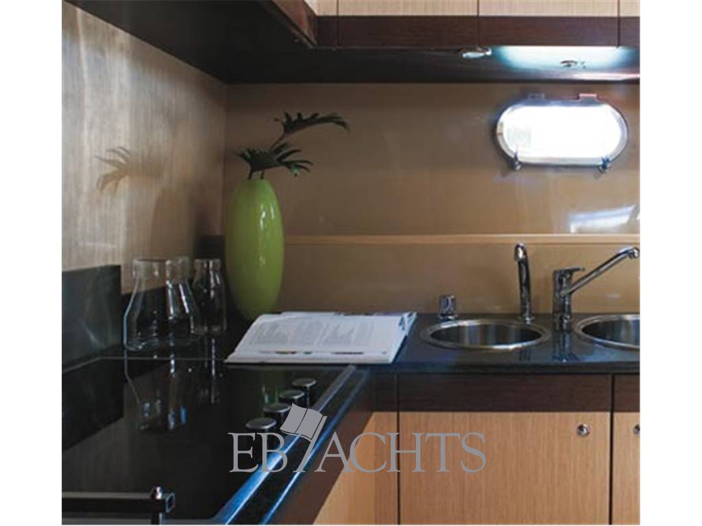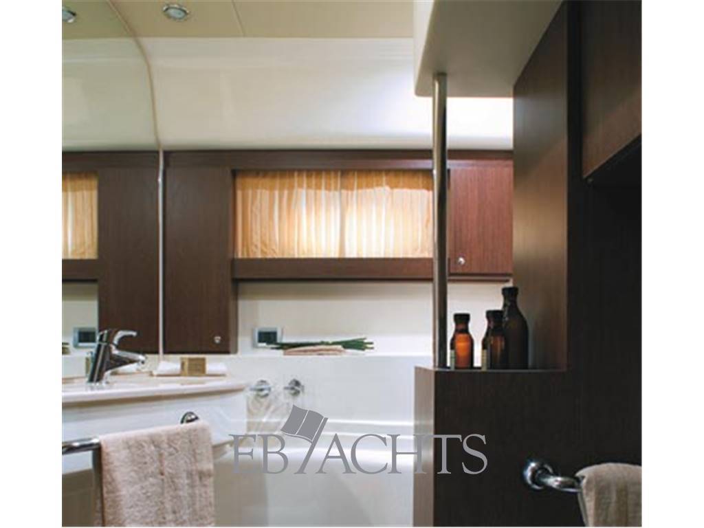 Gli ambienti interni, in rovere sbiancato e wengé, offrono tre cabine con tre bagni privati, oltre a due cabine equipaggio. Il design, luminoso e raffinato, unisce stile contemporaneo e comfort tipico del marchio Ferretti.