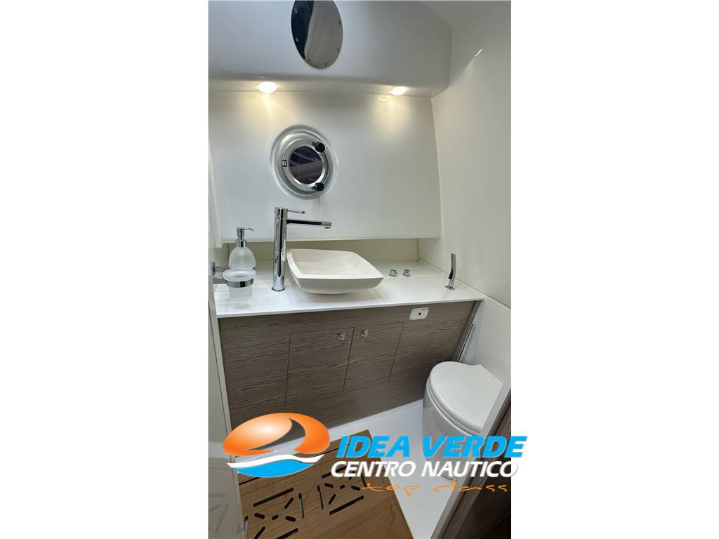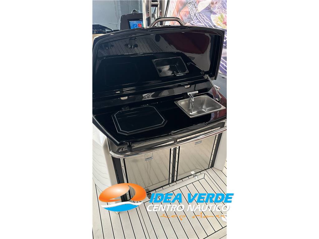 Gli interni del Strider 13 sono studiati per il massimo comfort. Il wetbar completo di lavello e frigorifero a cassettoni consente di organizzare pranzi e aperitivi in navigazione, mentre il WC marino elettrico con doccia separata assicura autonomia e privacy. L’aria condizionata mantiene freschi gli ambienti interni, completando un’esperienza di bordo confortevole e raffinata, perfetta anche per crociere più lunghe.