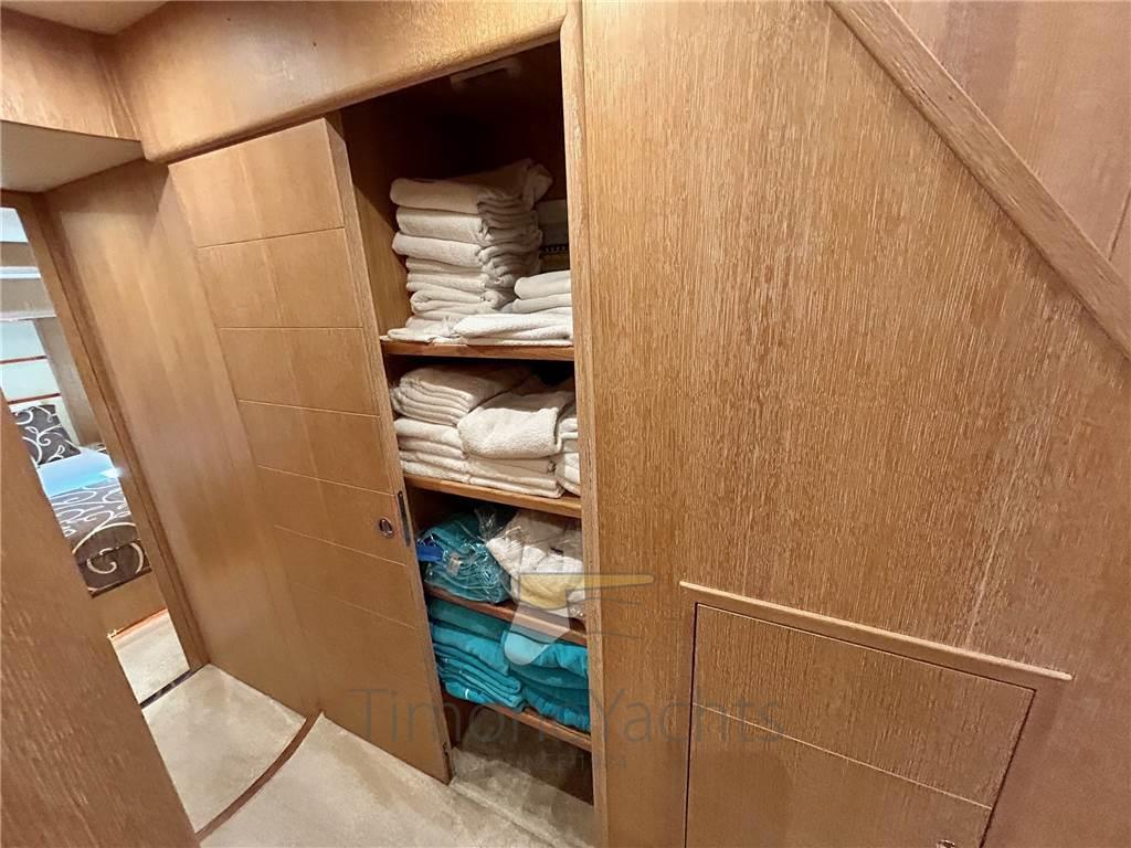 Allarme fumo/gas, Allarme motore, Allarme sentina, Ancora, Camminamenti laterali in teak, Doccia esterna, Elica di poppa - stern thruster, Elica di prua - bow thruster, Flap idraulici, Garage per tender (on bow deck, with crane), Indicatori Flaps, Lavaggio catena, Passerella, 2 Porta laterale, Pozzetto Teak, Tender, Tromba, Winch tonneggio di poppa.